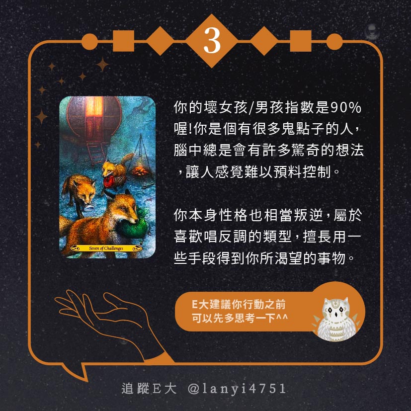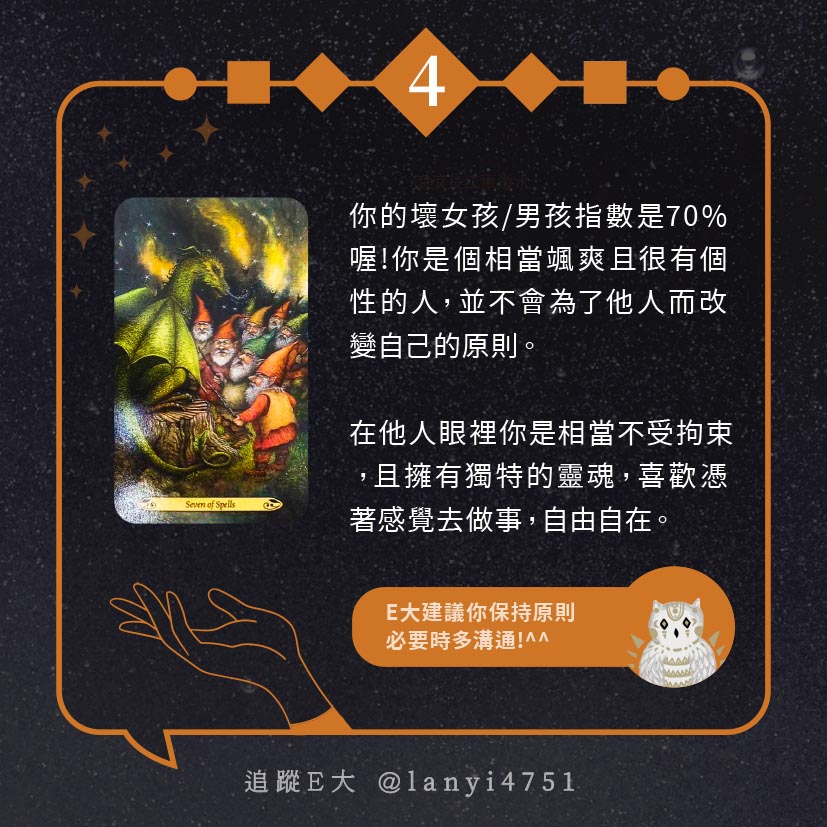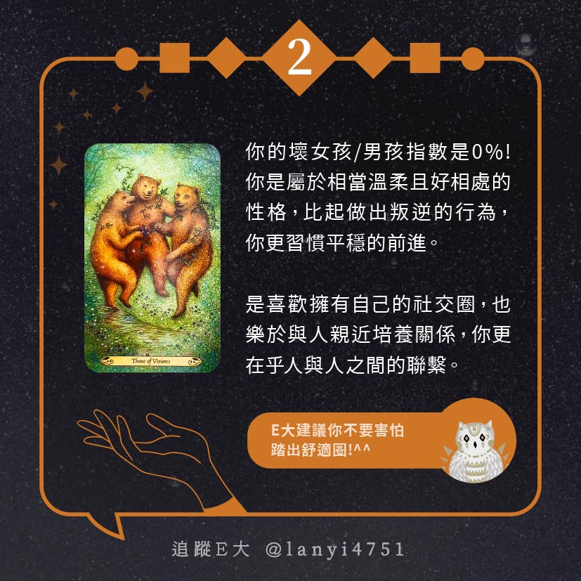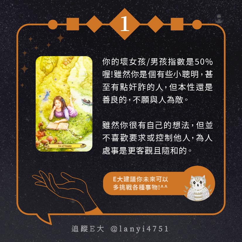 嗨~我是E大,歡迎你來到我的塔羅世界,每天會跟大家分享有趣的塔牌測驗,及塔羅知識喔!