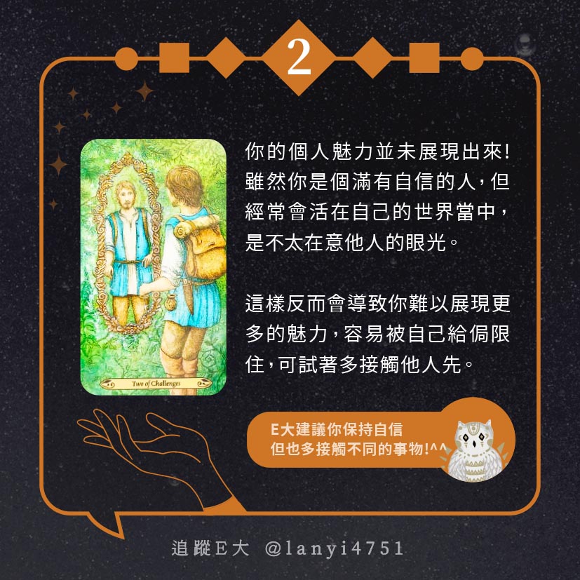 嗨~我是E大,歡迎你來到我的塔羅世界,每天會跟大家分享有趣的塔牌測驗,及塔羅知識喔!