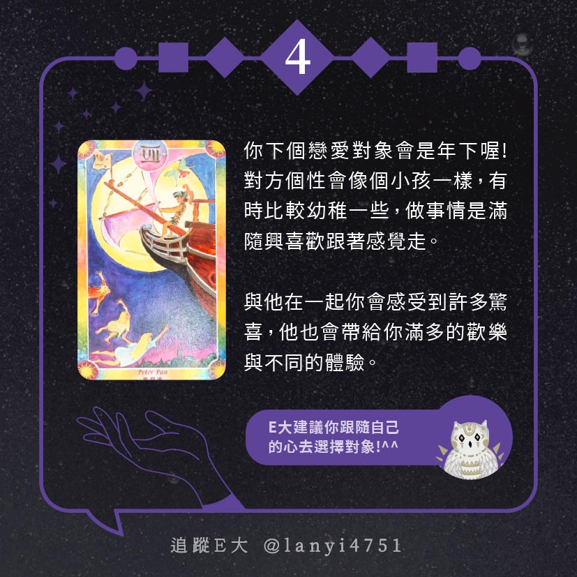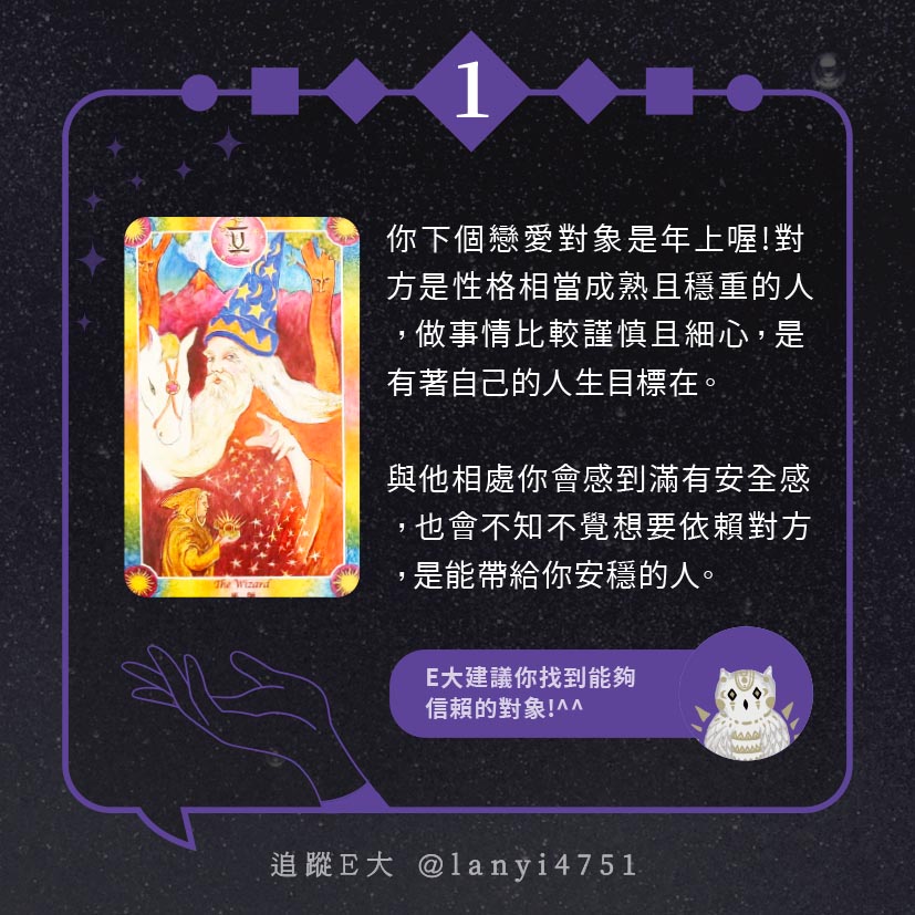 嗨~我是E大,歡迎你來到我的塔羅世界,每天會跟大家分享有趣的塔牌測驗,及塔羅知識喔!