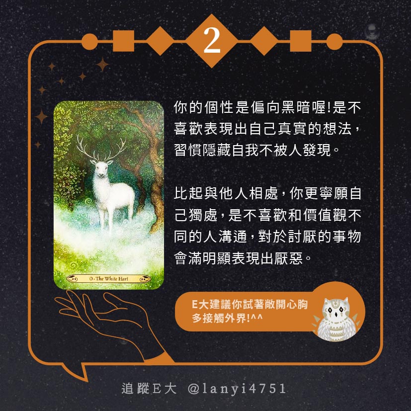 嗨~我是E大,歡迎你來到我的塔羅世界,每天會跟大家分享有趣的塔牌測驗,及塔羅知識喔!