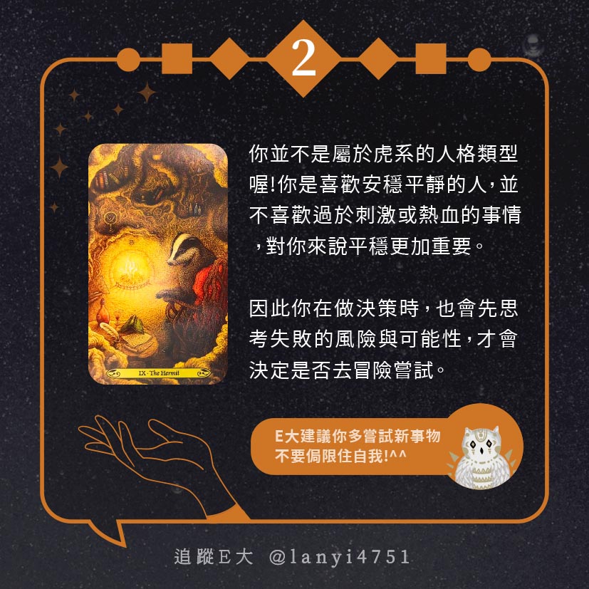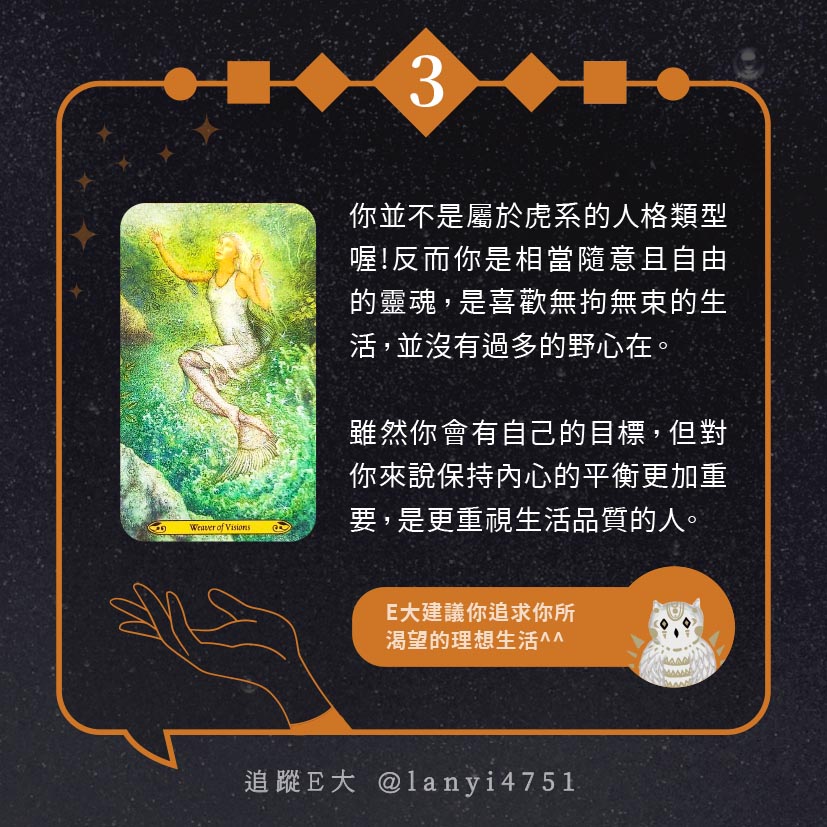 嗨~我是E大,歡迎你來到我的塔羅世界,每天會跟大家分享有趣的塔牌測驗,及塔羅知識喔!