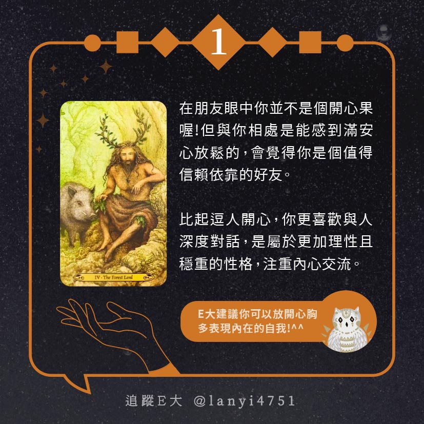 嗨~我是E大,歡迎你來到我的塔羅世界,每天會跟大家分享有趣的塔牌測驗,及塔羅知識喔!