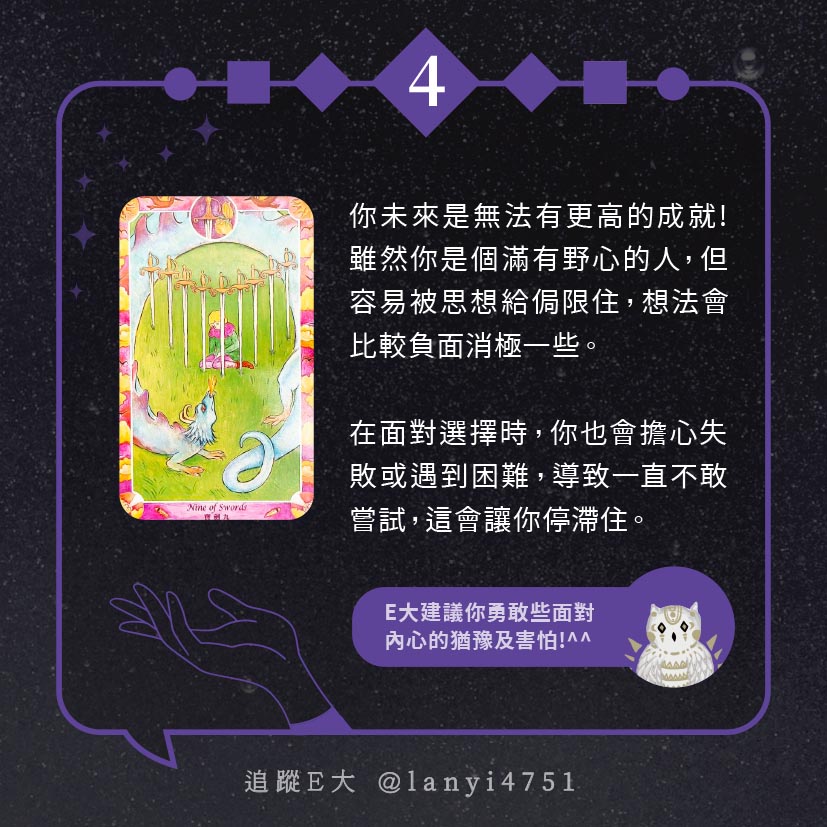 嗨~我是E大,歡迎你來到我的塔羅世界,每天會跟大家分享有趣的塔牌測驗,及塔羅知識喔!