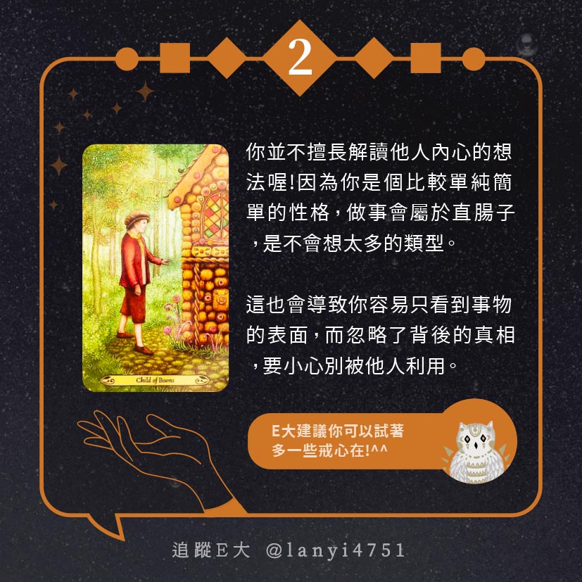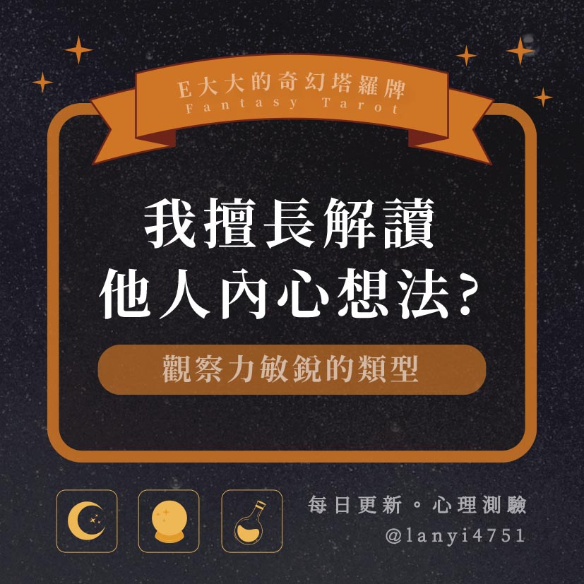 嗨~我是E大,歡迎你來到我的塔羅世界,每天會跟大家分享有趣的塔牌測驗,及塔羅知識喔!