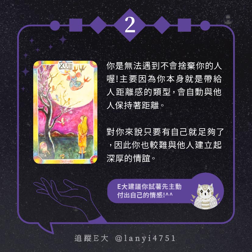 嗨~我是E大,歡迎你來到我的塔羅世界,每天會跟大家分享有趣的塔牌測驗,及塔羅知識喔!