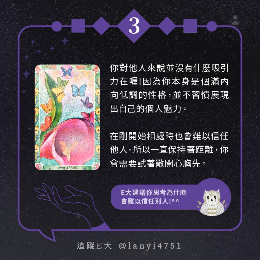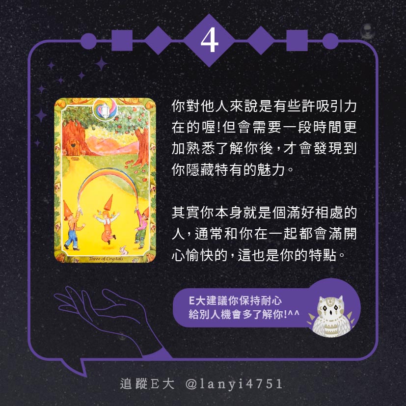 嗨~我是E大,歡迎你來到我的塔羅世界,每天會跟大家分享有趣的塔牌測驗,及塔羅知識喔!