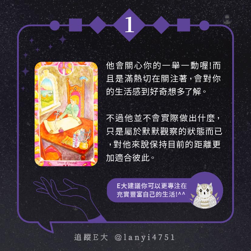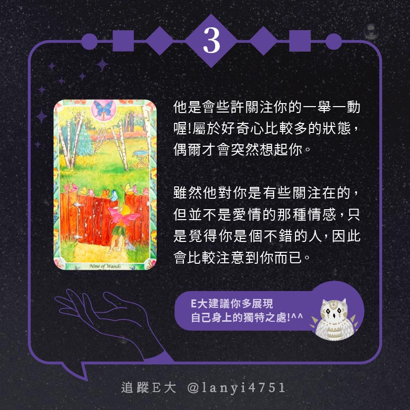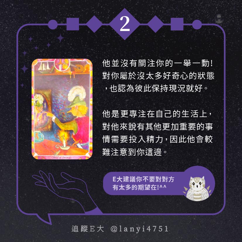 嗨~我是E大,歡迎你來到我的塔羅世界,每天會跟大家分享有趣的塔牌測驗,及塔羅知識喔!