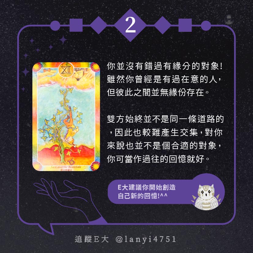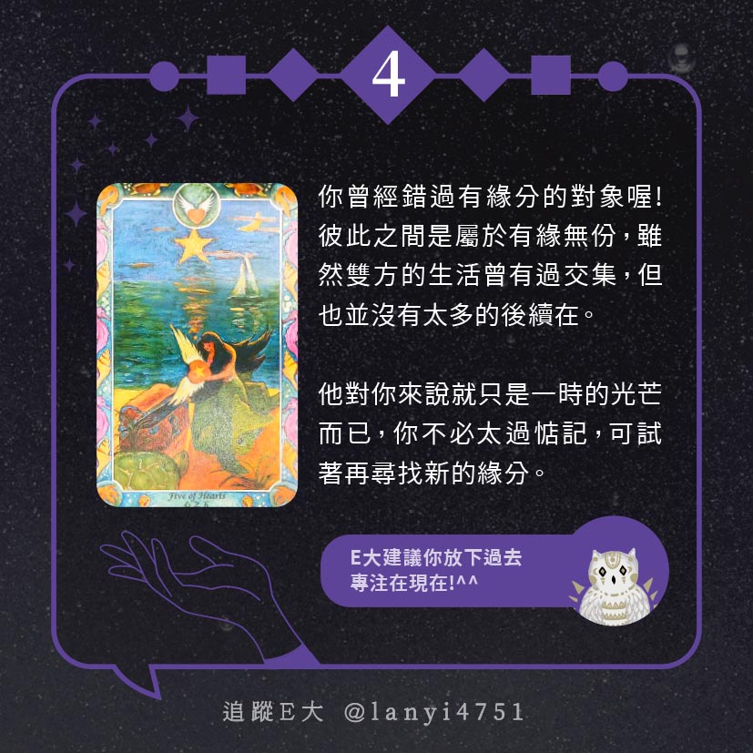嗨~我是E大,歡迎你來到我的塔羅世界,每天會跟大家分享有趣的塔牌測驗,及塔羅知識喔!