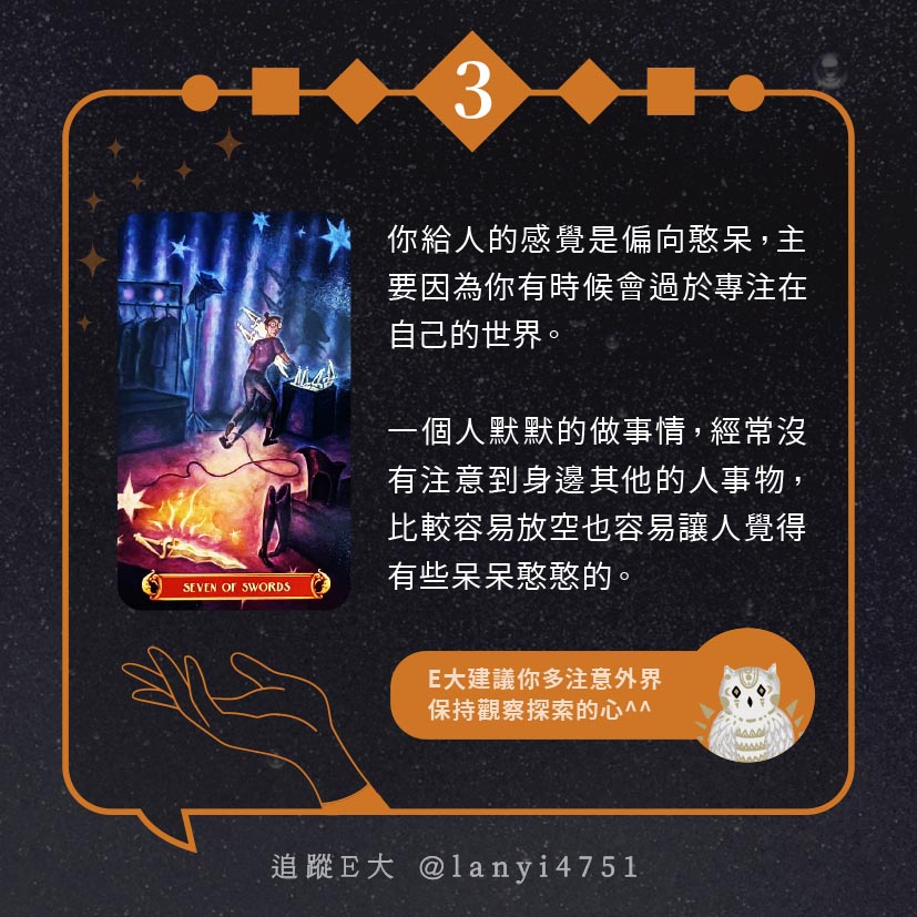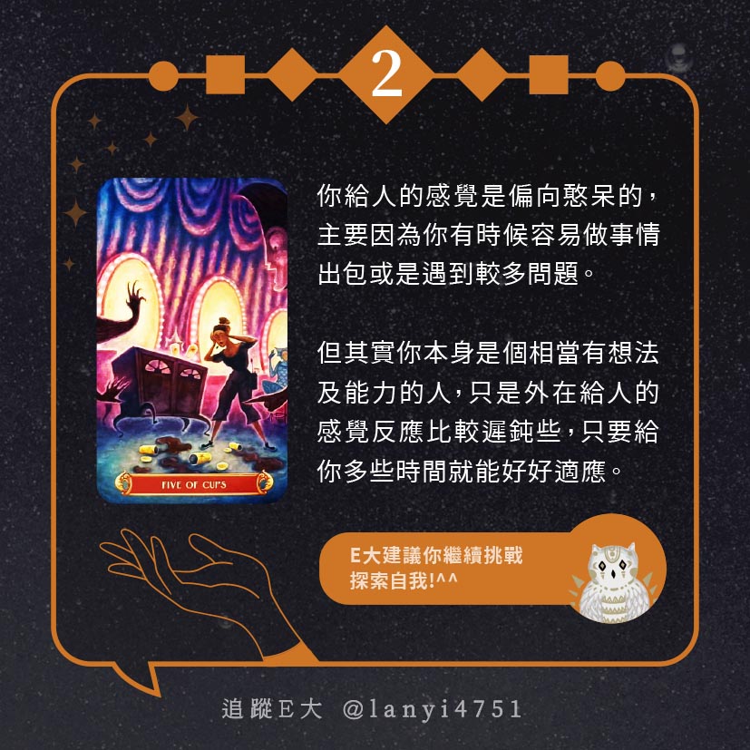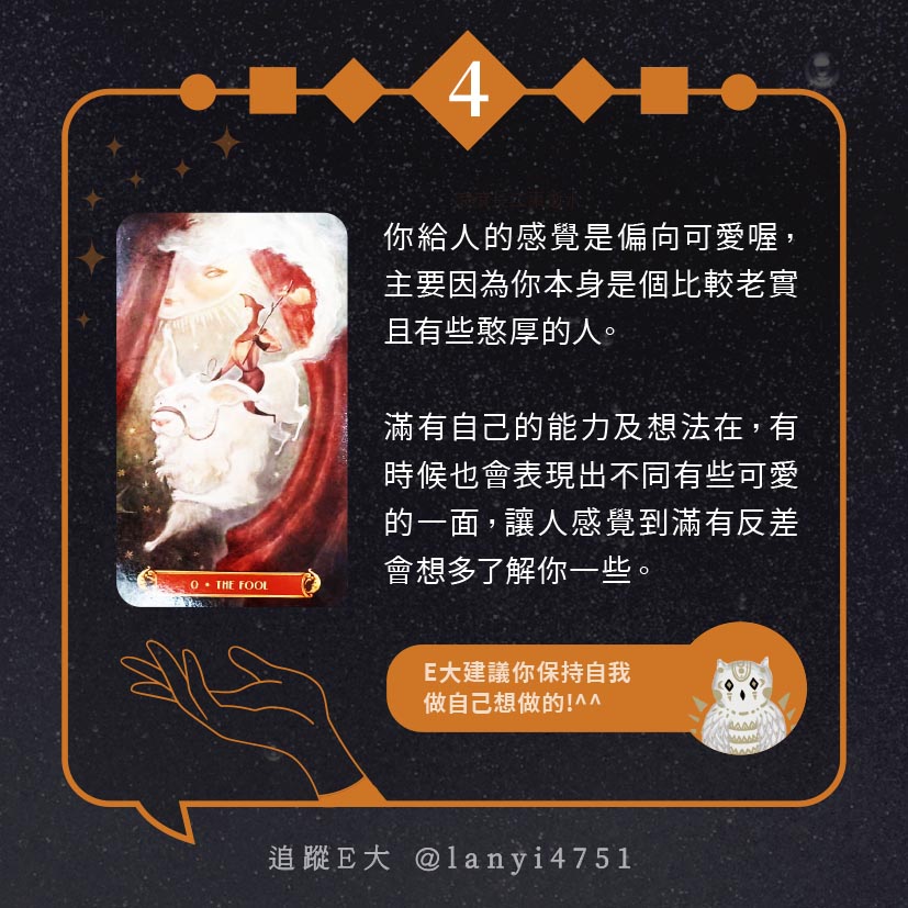 嗨~我是E大,歡迎你來到我的塔羅世界,每天會跟大家分享有趣的塔牌測驗,及塔羅知識喔!