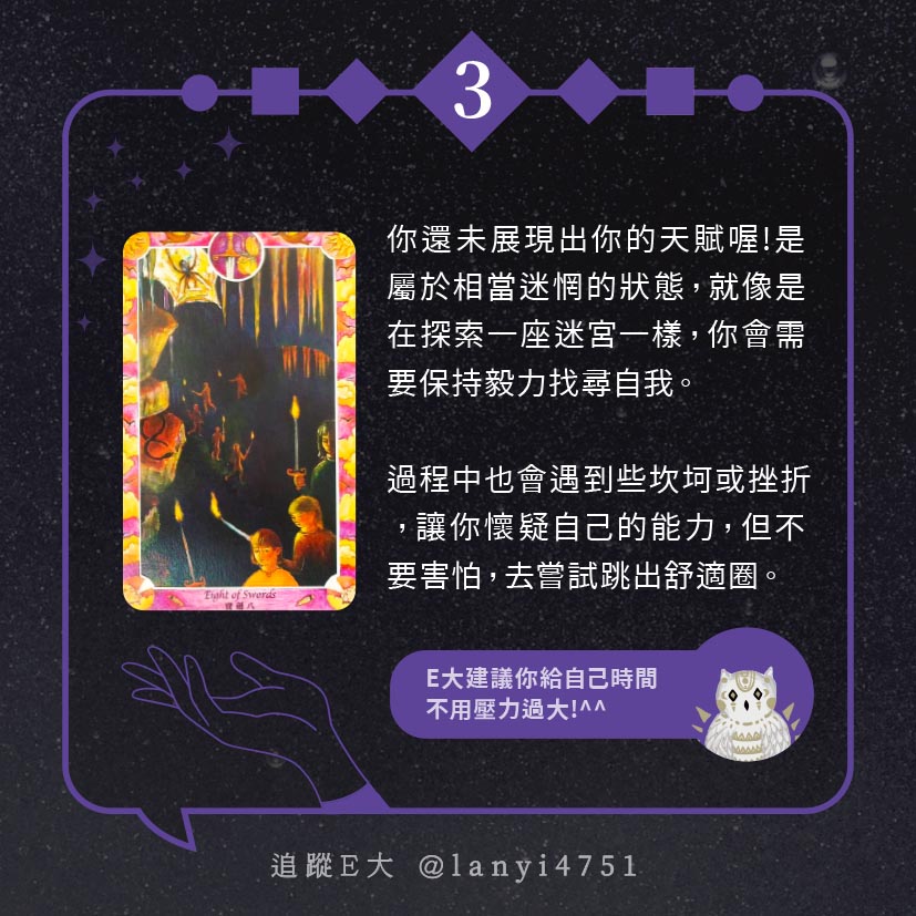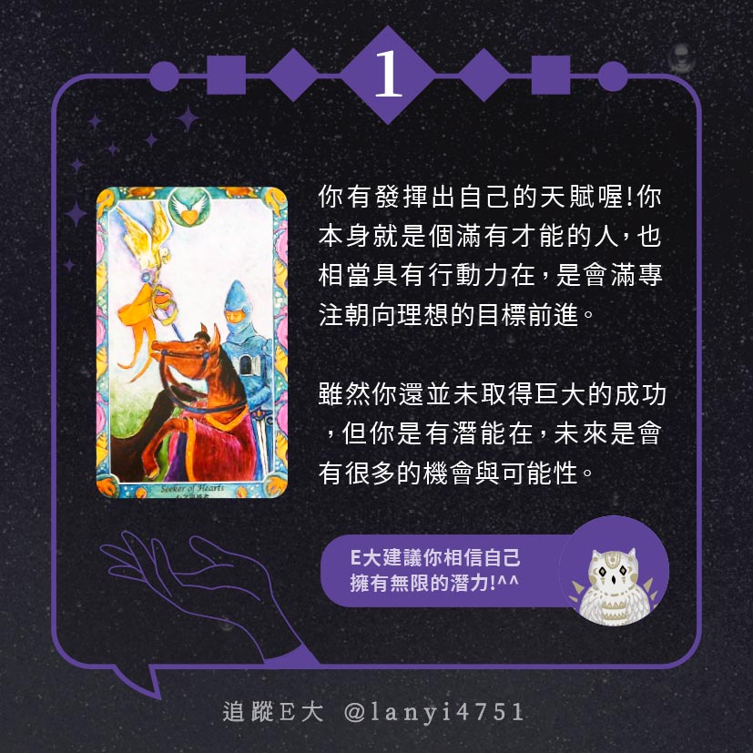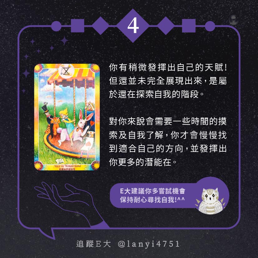 嗨~我是E大,歡迎你來到我的塔羅世界,每天會跟大家分享有趣的塔牌測驗,及塔羅知識喔!