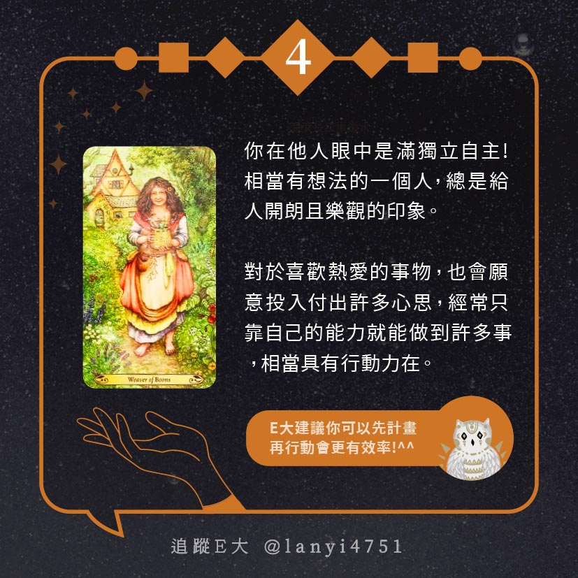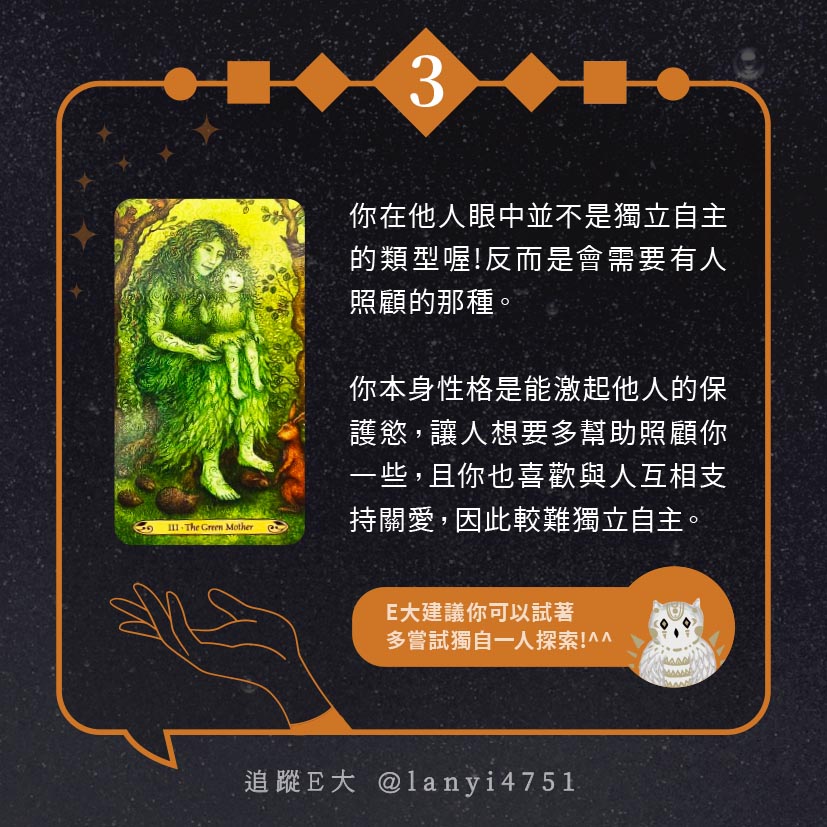 嗨~我是E大,歡迎你來到我的塔羅世界,每天會跟大家分享有趣的塔牌測驗,及塔羅知識喔!