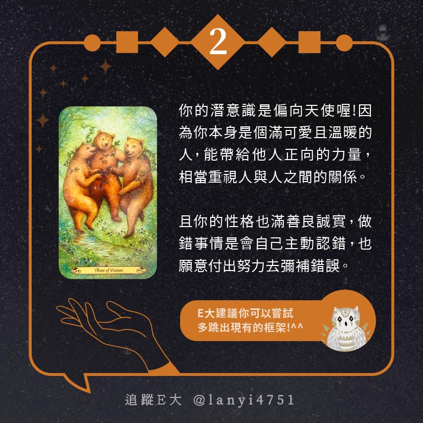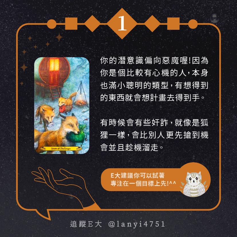 嗨~我是E大,歡迎你來到我的塔羅世界,每天會跟大家分享有趣的塔牌測驗,及塔羅知識喔!