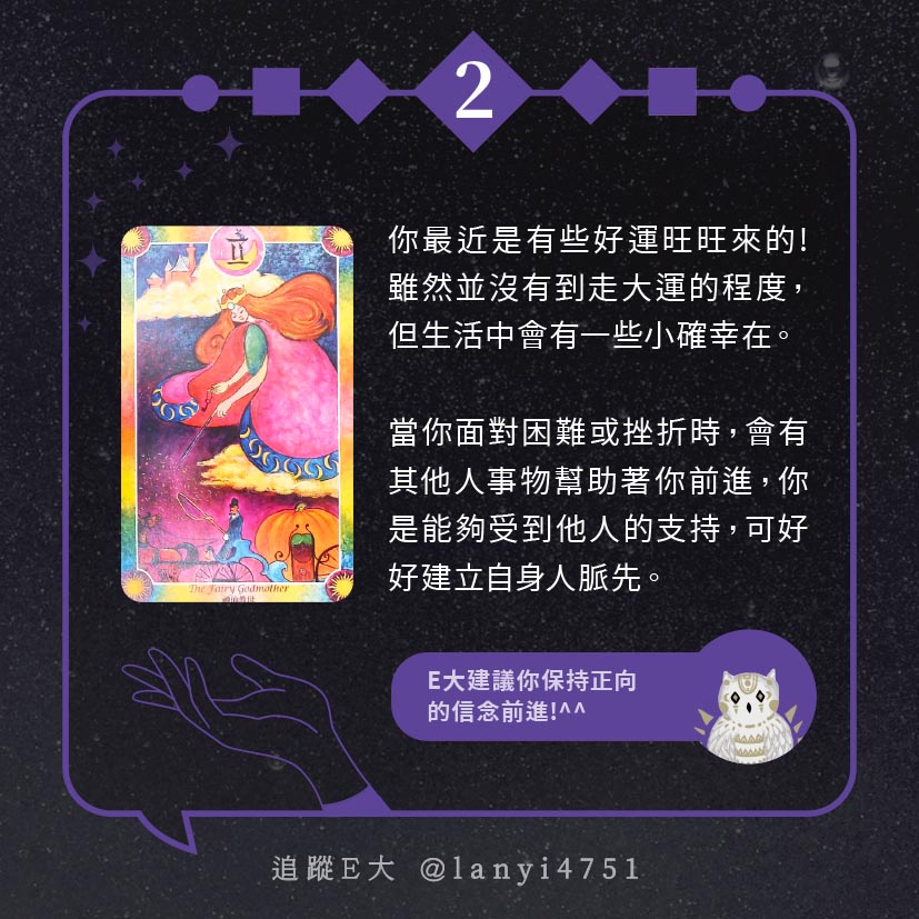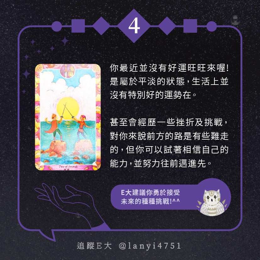 嗨~我是E大,歡迎你來到我的塔羅世界,每天會跟大家分享有趣的塔牌測驗,及塔羅知識喔!
