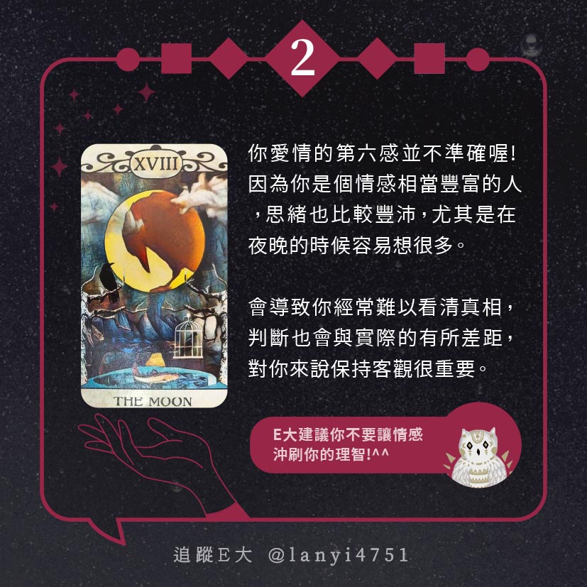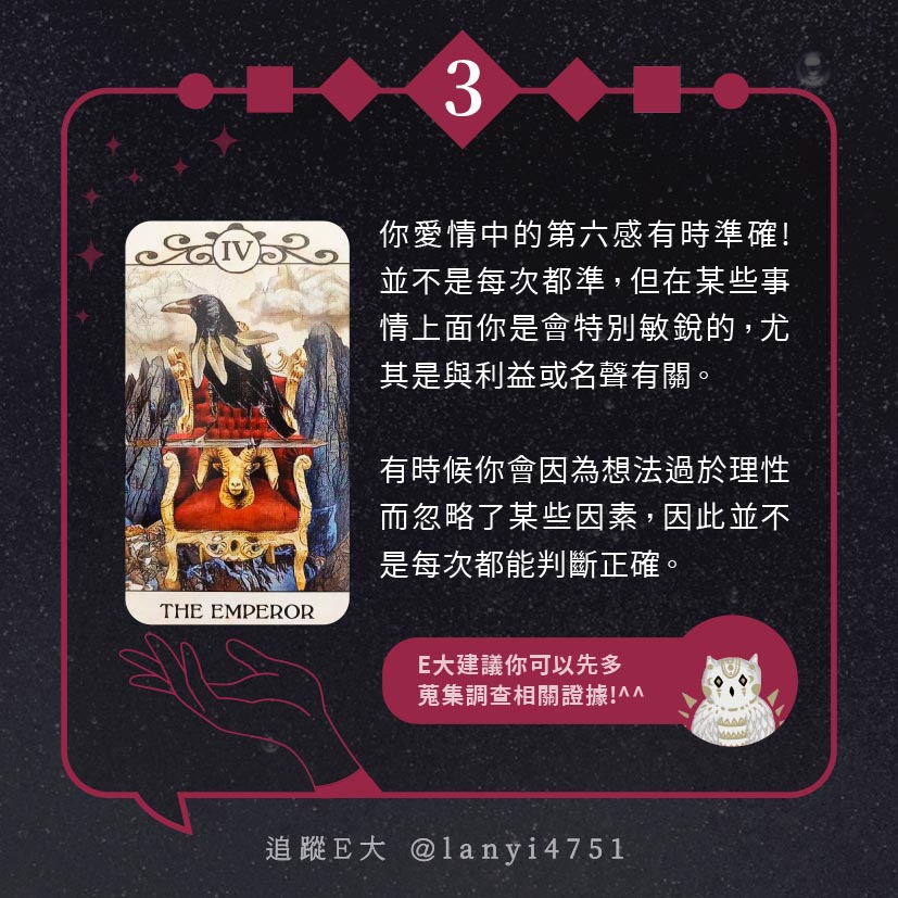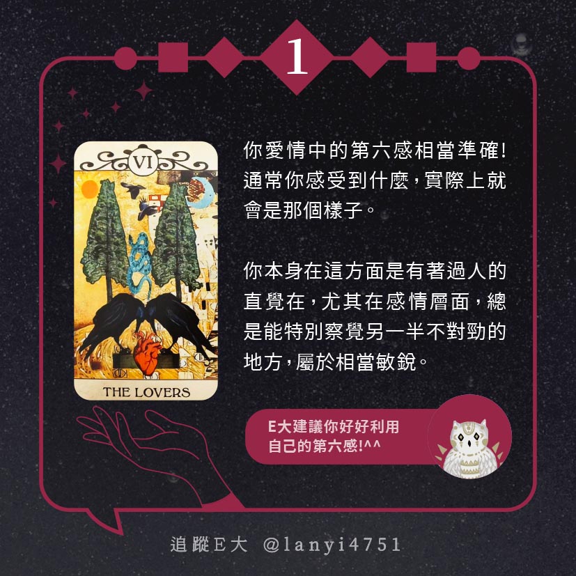 嗨~我是E大,歡迎你來到我的塔羅世界,每天會跟大家分享有趣的塔牌測驗,及塔羅知識喔!