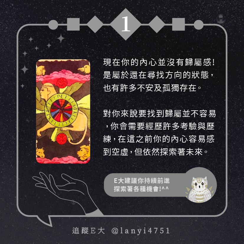 嗨~我是E大,歡迎你來到我的塔羅世界,每天會跟大家分享有趣的塔牌測驗,及塔羅知識喔!