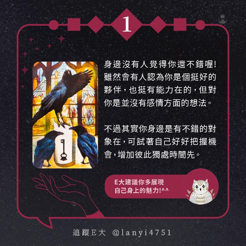 嗨~我是E大,歡迎你來到我的塔羅世界,每天會跟大家分享有趣的塔牌測驗,及塔羅知識喔!