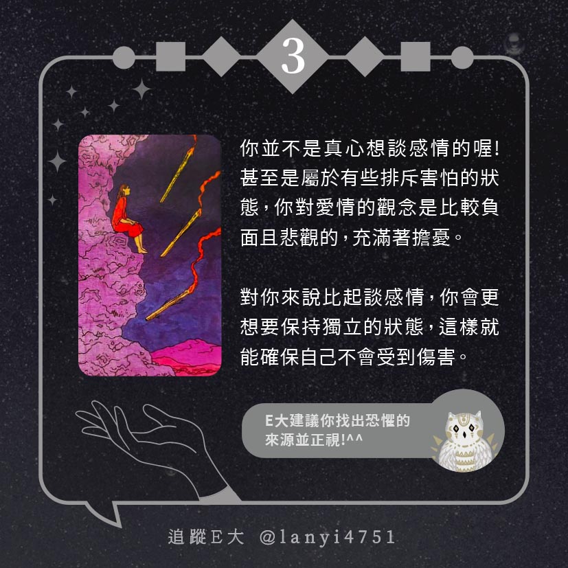 嗨~我是E大,歡迎你來到我的塔羅世界,每天會跟大家分享有趣的塔牌測驗,及塔羅知識喔!