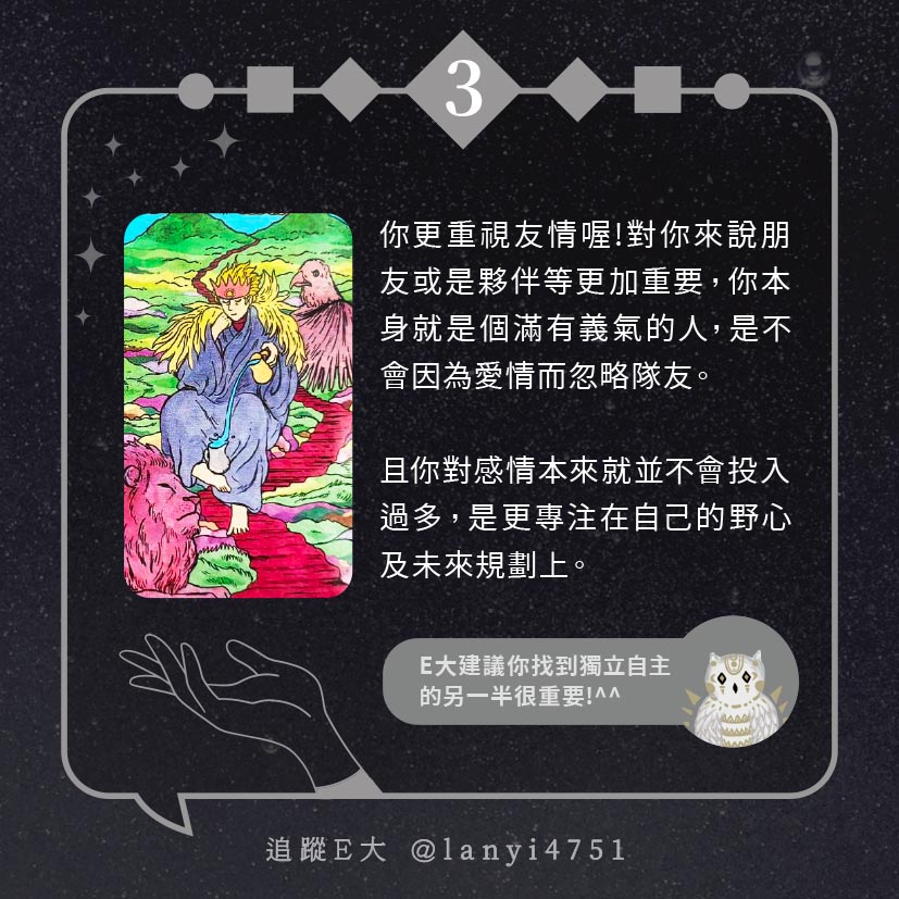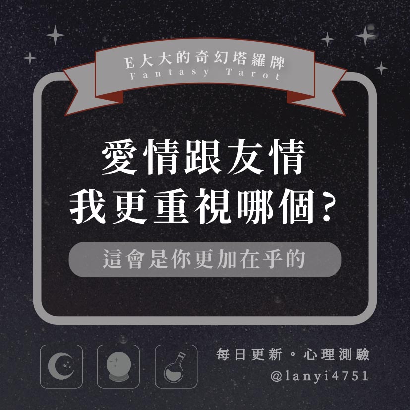 嗨~我是E大,歡迎你來到我的塔羅世界,每天會跟大家分享有趣的塔牌測驗,及塔羅知識喔!