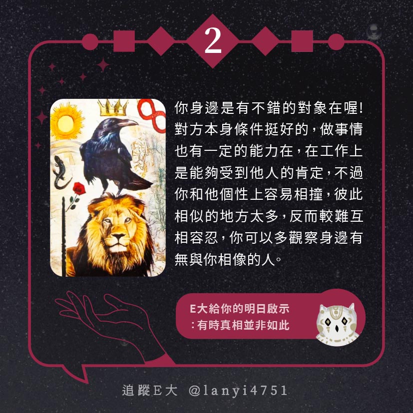 嗨~我是E大,歡迎你來到我的塔羅世界,每天會跟大家分享有趣的塔牌測驗,及塔羅知識喔!