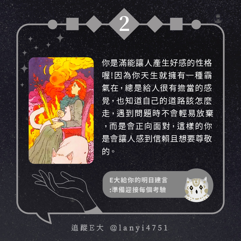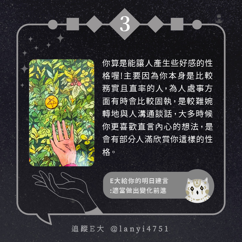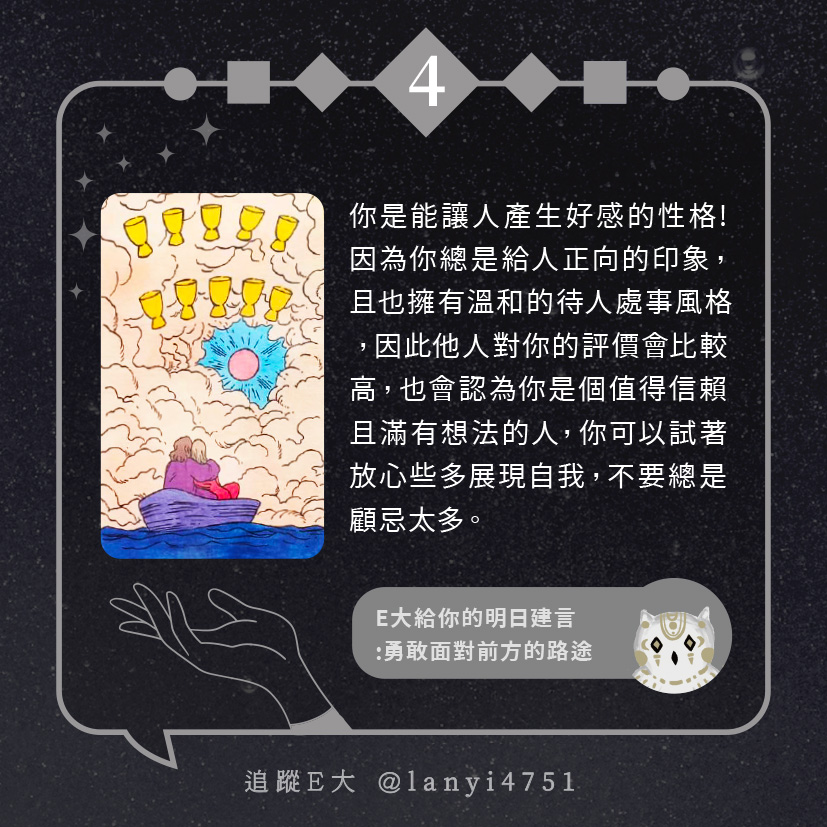 嗨~我是E大,歡迎你來到我的塔羅世界,每天會跟大家分享有趣的塔牌測驗及塔羅知識喔!
