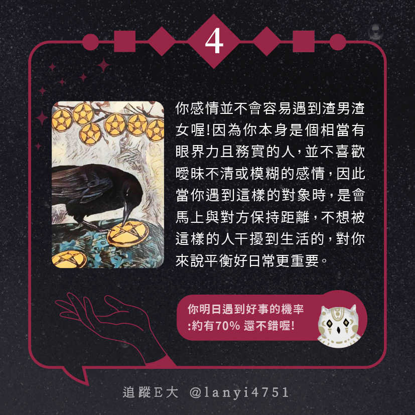 嗨~我是E大,歡迎你來到我的塔羅世界,每天會跟大家分享有趣的塔牌測驗,及塔羅知識喔!