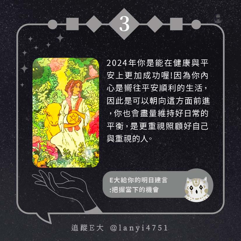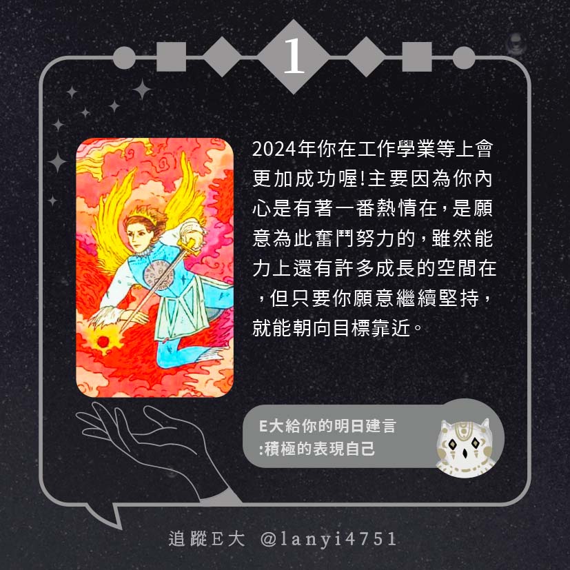嗨~我是E大,歡迎你來到我的塔羅世界,每天會跟大家分享有趣的塔牌測驗及塔羅知識喔!