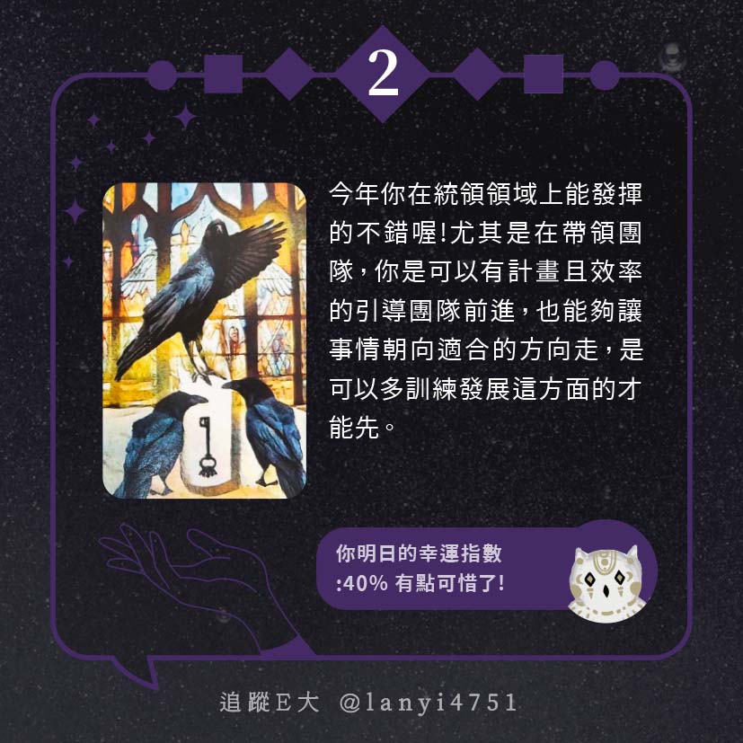 嗨~我是E大,歡迎你來到我的塔羅世界,每天會跟大家分享有趣的塔牌測驗,及塔羅知識喔!