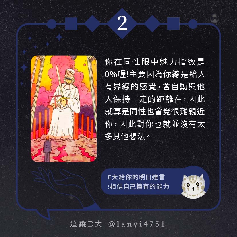 嗨~我是E大,歡迎你來到我的塔羅世界,每天會跟大家分享有趣的塔牌測驗及塔羅知識喔!