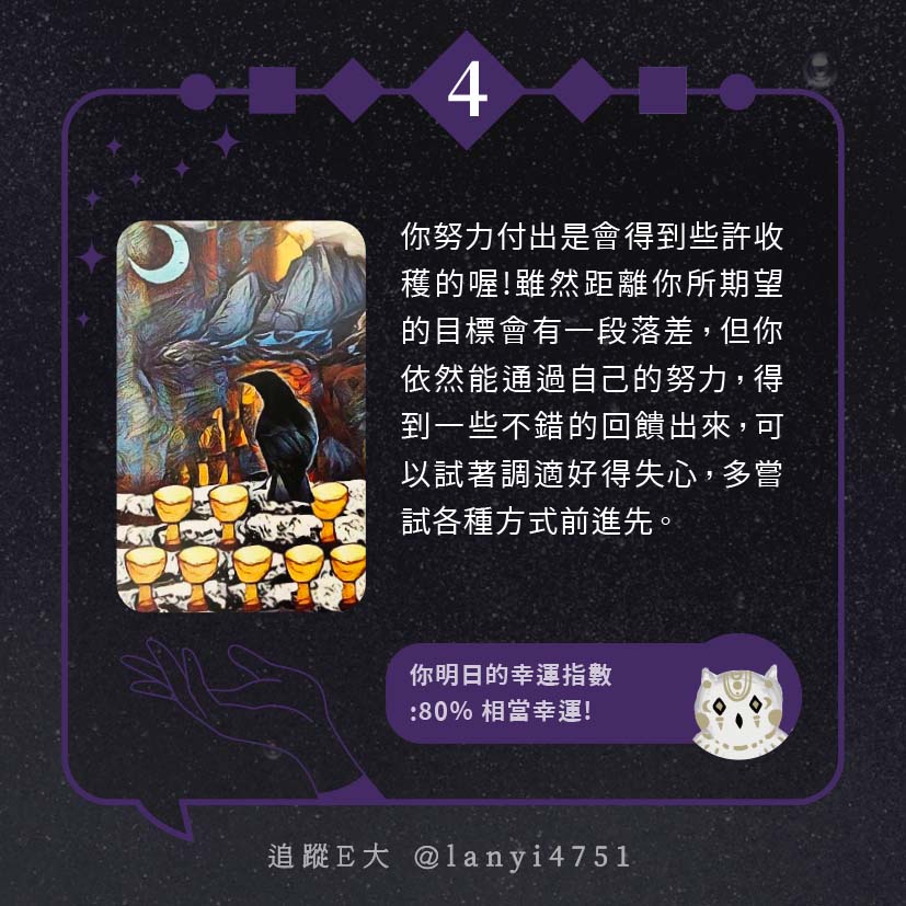 嗨~我是E大,歡迎你來到我的塔羅世界,每天會跟大家分享有趣的塔牌測驗,及塔羅知識喔!