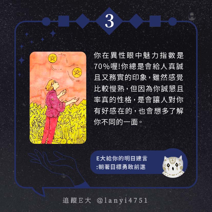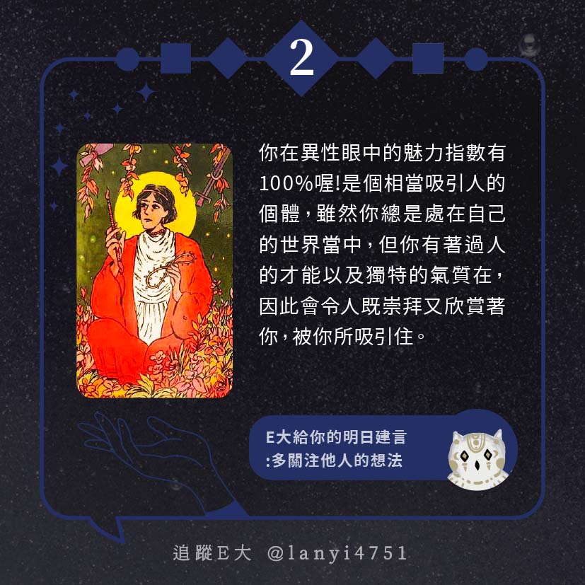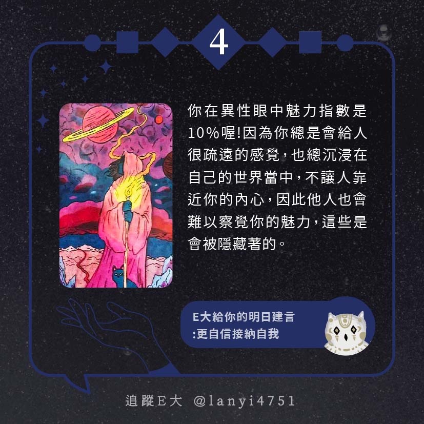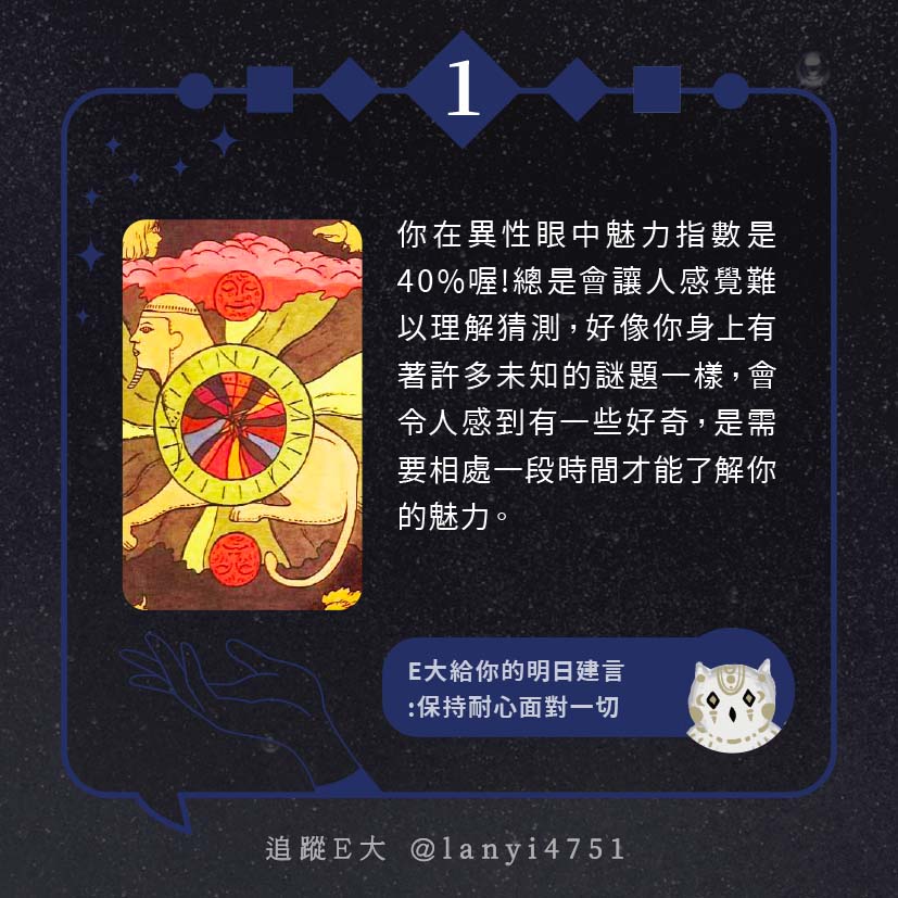 嗨~我是E大,歡迎你來到我的塔羅世界,每天會跟大家分享有趣的塔牌測驗及塔羅知識喔!