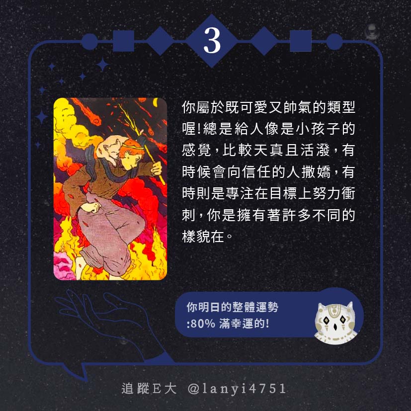 嗨~我是E大,歡迎你來到我的塔羅世界,每天會跟大家分享有趣的塔牌測驗及塔羅知識喔!