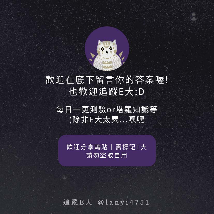 嗨~我是E大,歡迎你來到我的塔羅世界,每天會跟大家分享有趣的塔牌測驗,及塔羅知識喔!
