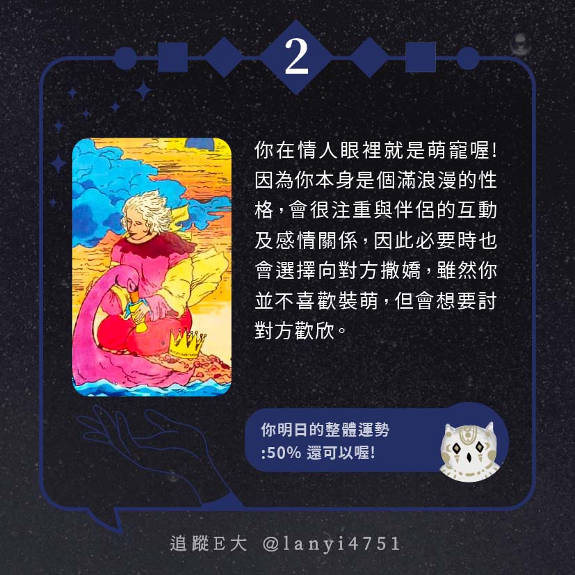 嗨~我是E大,歡迎你來到我的塔羅世界,每天會跟大家分享有趣的塔牌測驗及塔羅知識喔!