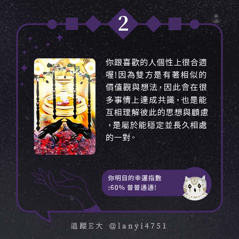 嗨~我是E大,歡迎你來到我的塔羅世界,每天會跟大家分享有趣的塔牌測驗,及塔羅知識喔!
