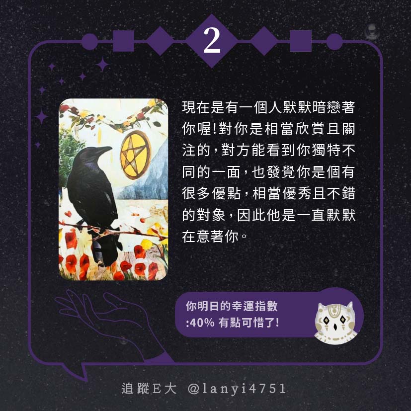 嗨~我是E大,歡迎你來到我的塔羅世界,每天會跟大家分享有趣的塔牌測驗,及塔羅知識喔!