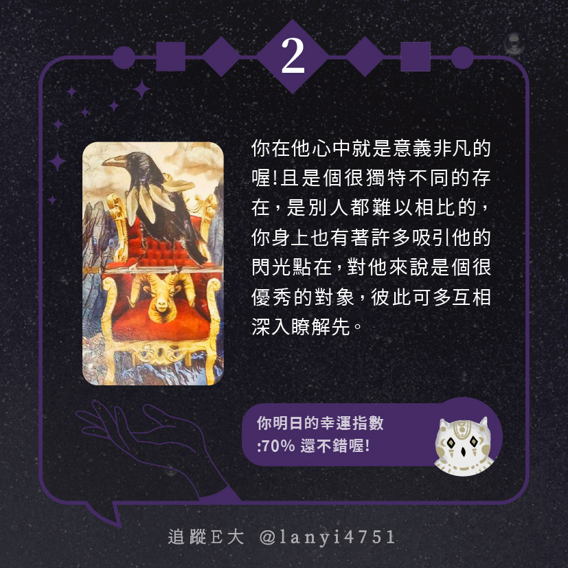 嗨~我是E大,歡迎你來到我的塔羅世界,每天會跟大家分享有趣的塔牌測驗,及塔羅知識喔!
