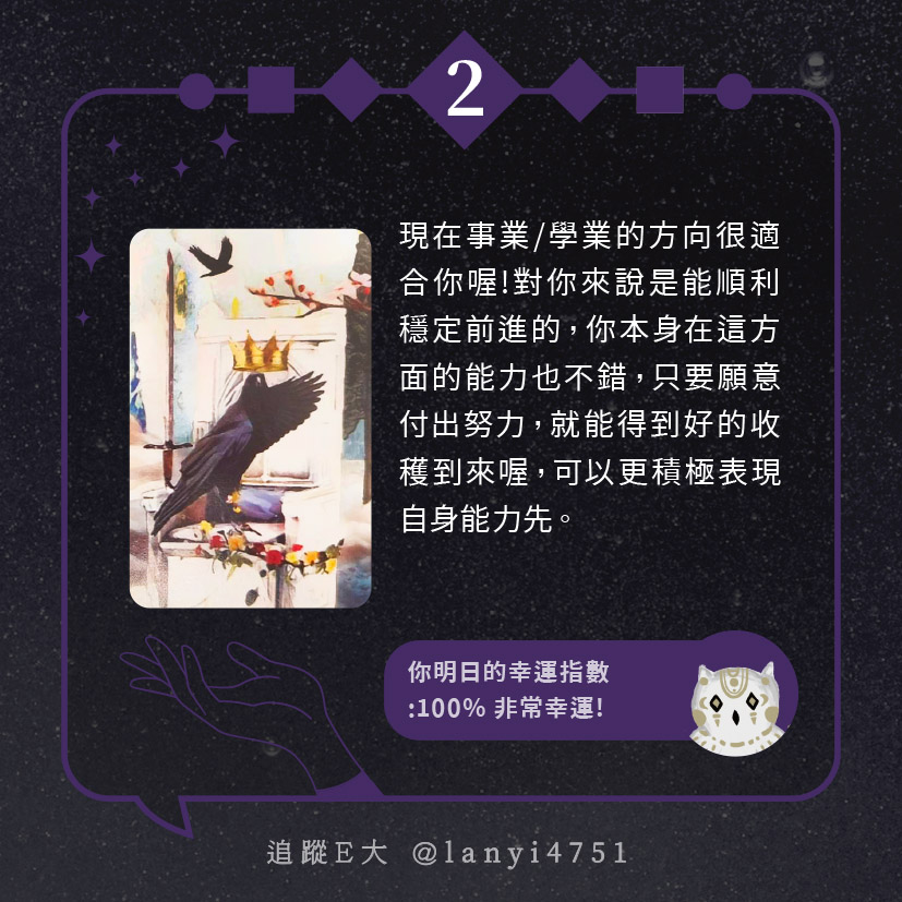 嗨~我是E大,歡迎你來到我的塔羅世界,每天會跟大家分享有趣的塔牌測驗,及塔羅知識喔!