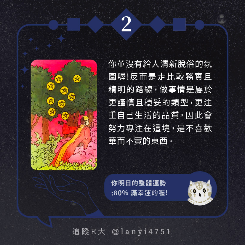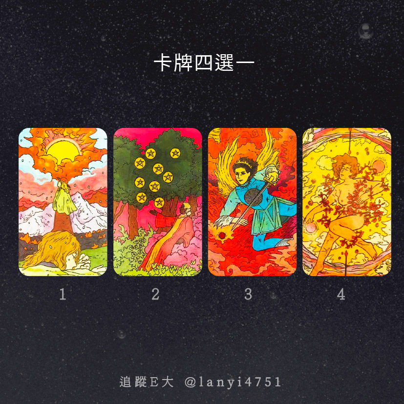 嗨~我是E大,歡迎你來到我的塔羅世界,每天會跟大家分享有趣的塔牌測驗及塔羅知識喔!