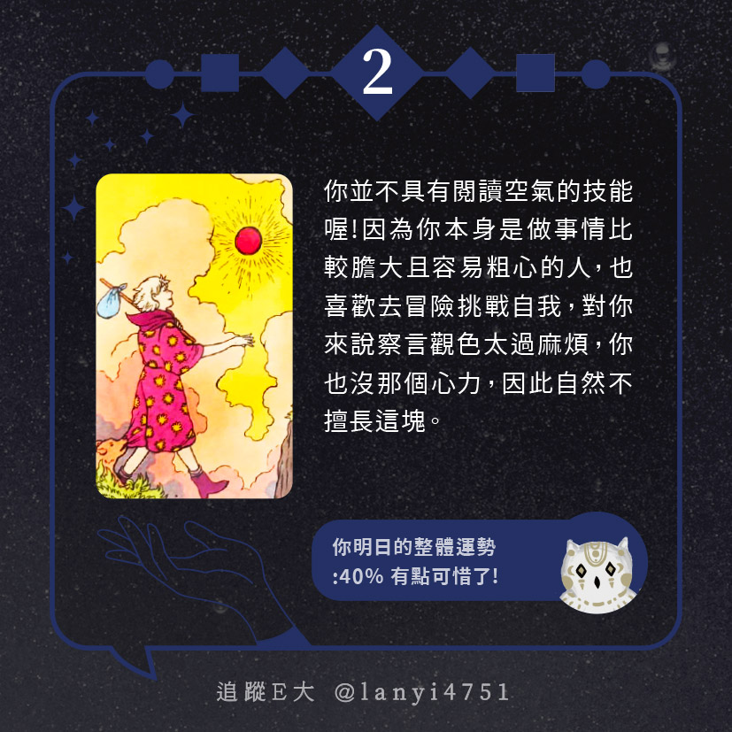 嗨~我是E大,歡迎你來到我的塔羅世界,每天會跟大家分享有趣的塔牌測驗及塔羅知識喔!
