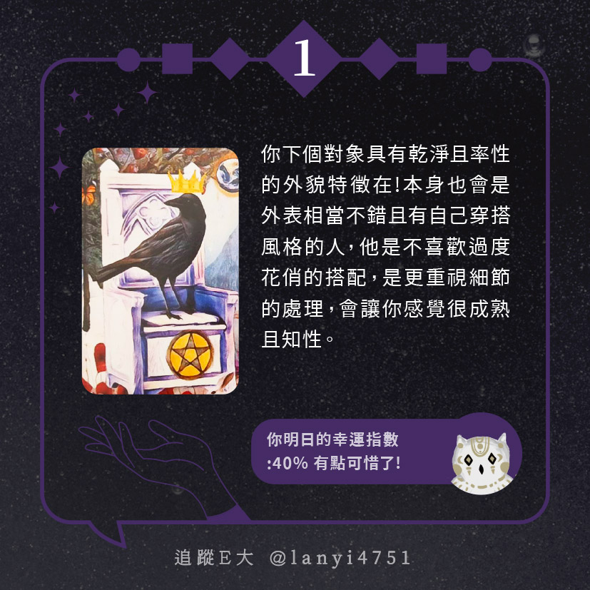 嗨~我是E大,歡迎你來到我的塔羅世界,每天會跟大家分享有趣的塔牌測驗,及塔羅知識喔!