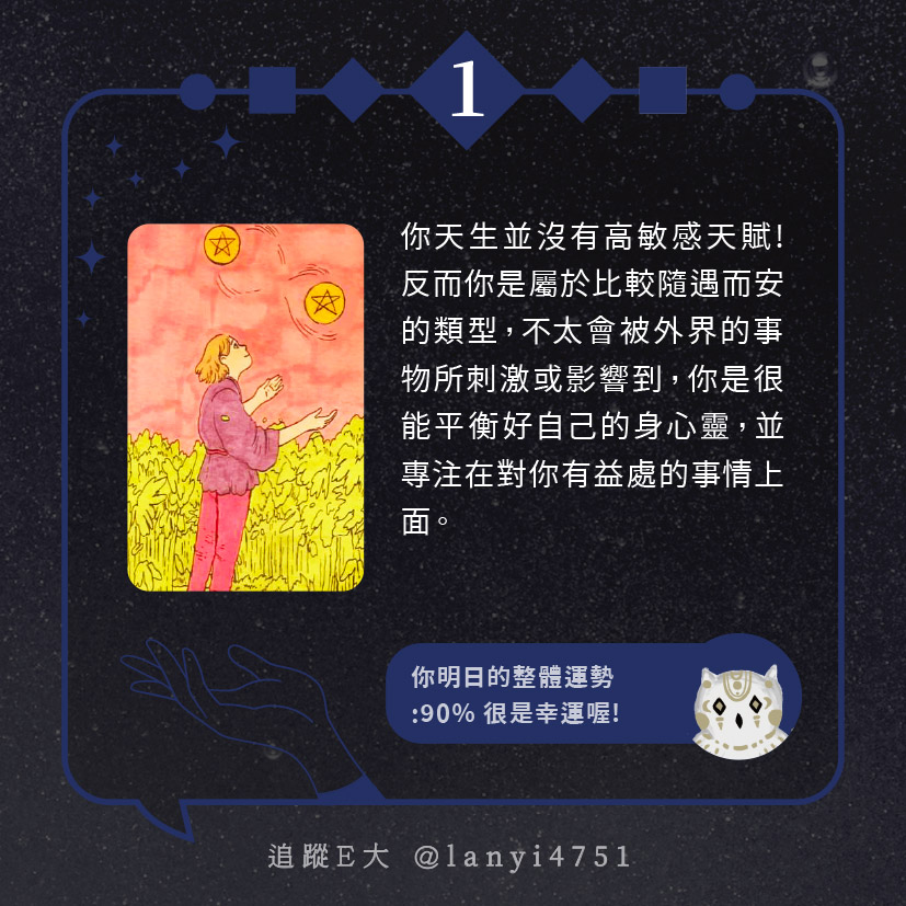 嗨~我是E大,歡迎你來到我的塔羅世界,每天會跟大家分享有趣的塔牌測驗及塔羅知識喔!