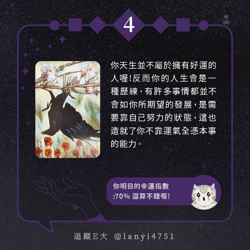 嗨~我是E大,歡迎你來到我的塔羅世界,每天會跟大家分享有趣的塔牌測驗,及塔羅知識喔!