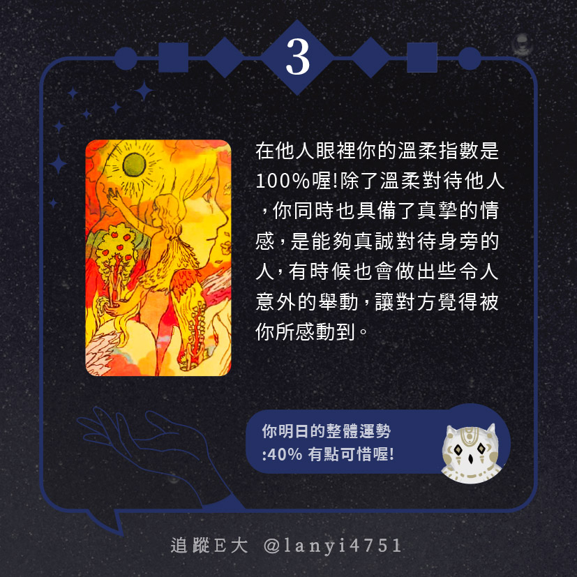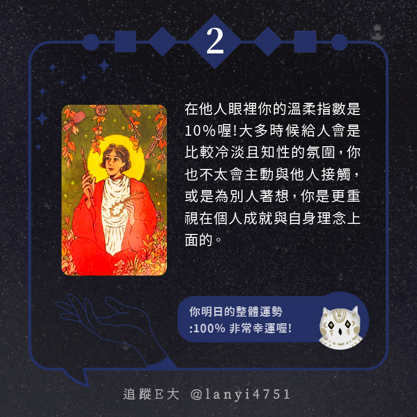 在他人眼裡我的溫柔指數?總給人柔和親切的氛圍|心理測驗|E大大 發表於2024 年 4 月 17 日 由E大大撰寫 嗨~我是E大,歡迎你來到我的塔羅世界,每天會跟大家分享有趣的塔牌測驗及塔羅知識喔! E大社群 / 占卜預約👉 https://linktr.ee/lanyi4751 E大社群 / 占卜預約👉 https://linktr.ee/lanyi4751 分享此文: 分享到 X(在新視窗中開啟) X 分享到 Facebook(在新視窗中開啟) Facebook 喜歡 正在載入... 相關