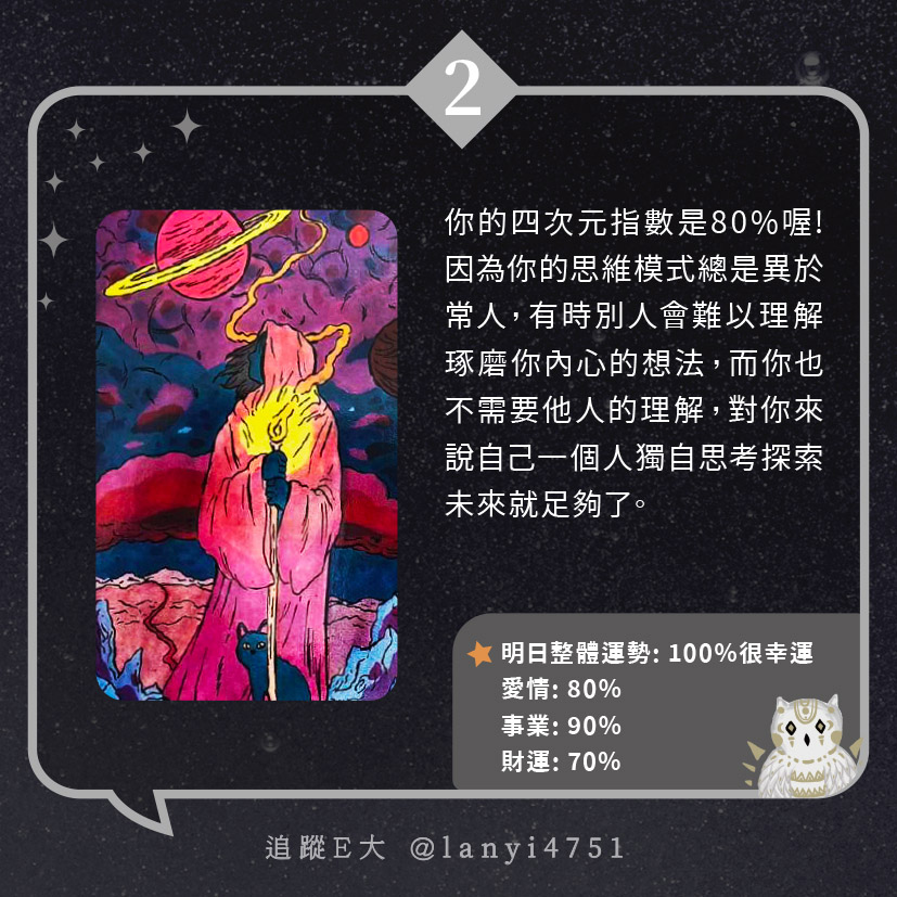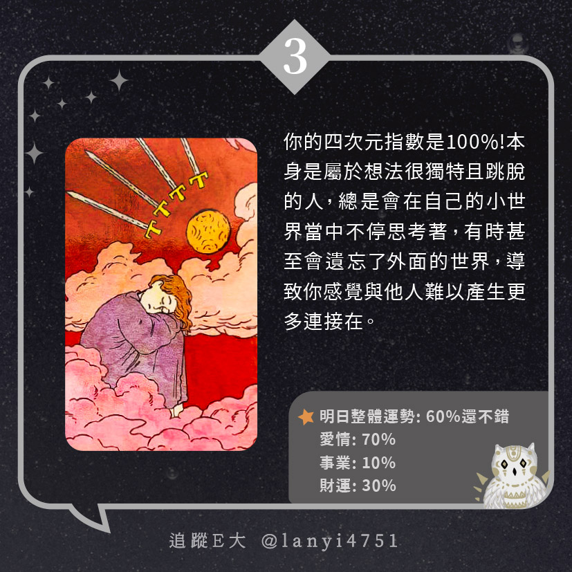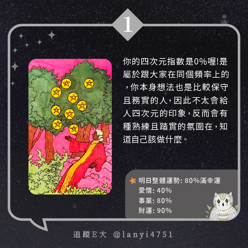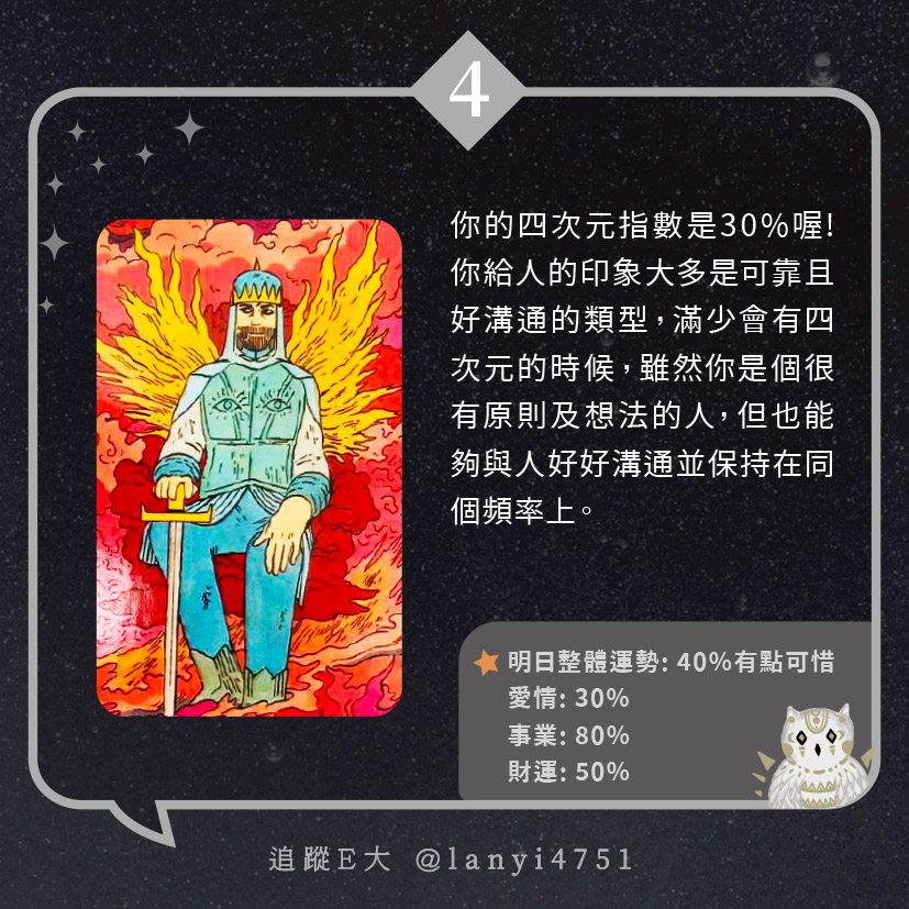 我的四次元指數有多少呢?給人奇怪又獨特的氛圍|心理測驗|E大大 發表於2024 年 5 月 5 日 由E大大撰寫 嗨~我是E大,歡迎你來到我的塔羅世界,每天會跟大家分享有趣的塔牌測驗及塔羅知識喔! E大社群 / 占卜預約👉 https://linktr.ee/lanyi4751 E大社群 / 占卜預約👉 https://linktr.ee/lanyi4751 分享此文: 分享到 X(在新視窗中開啟) X 分享到 Facebook(在新視窗中開啟) Facebook 喜歡 正在載入... 相關