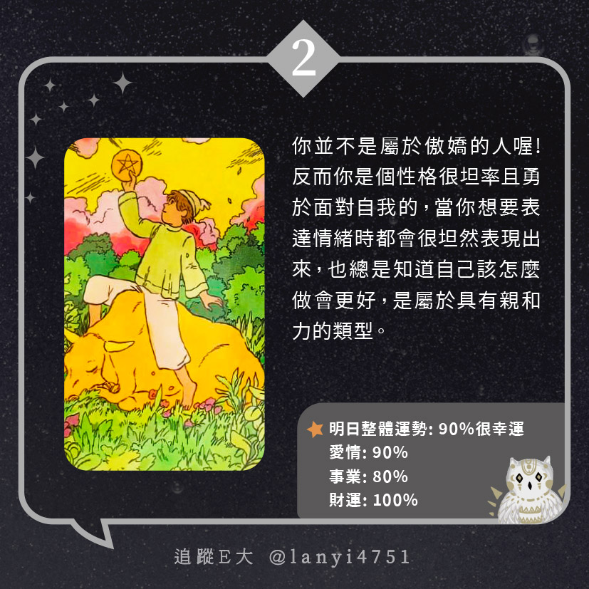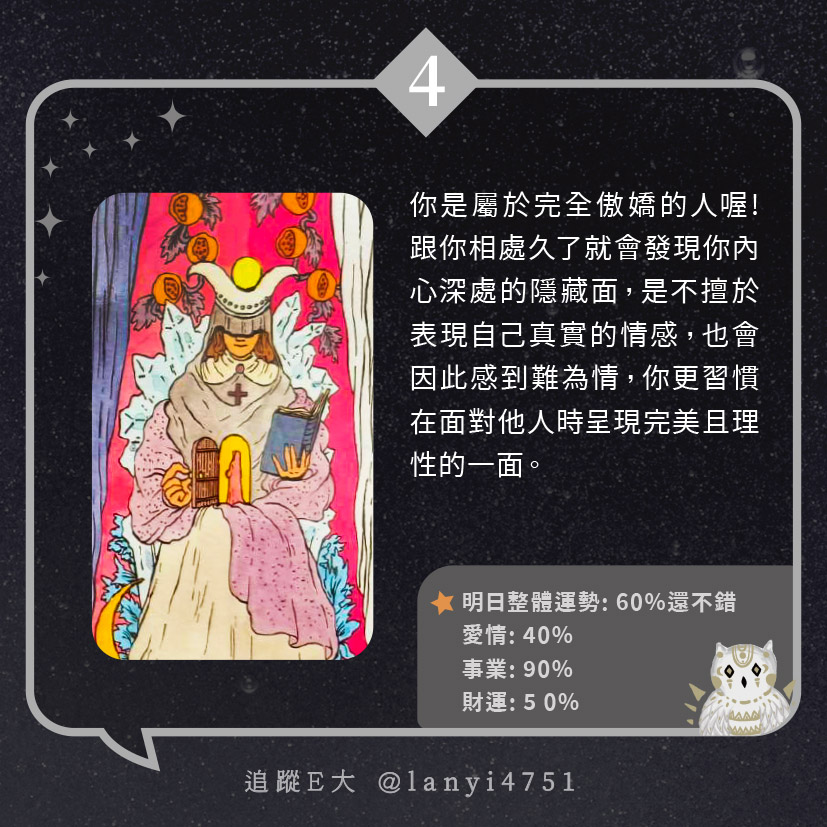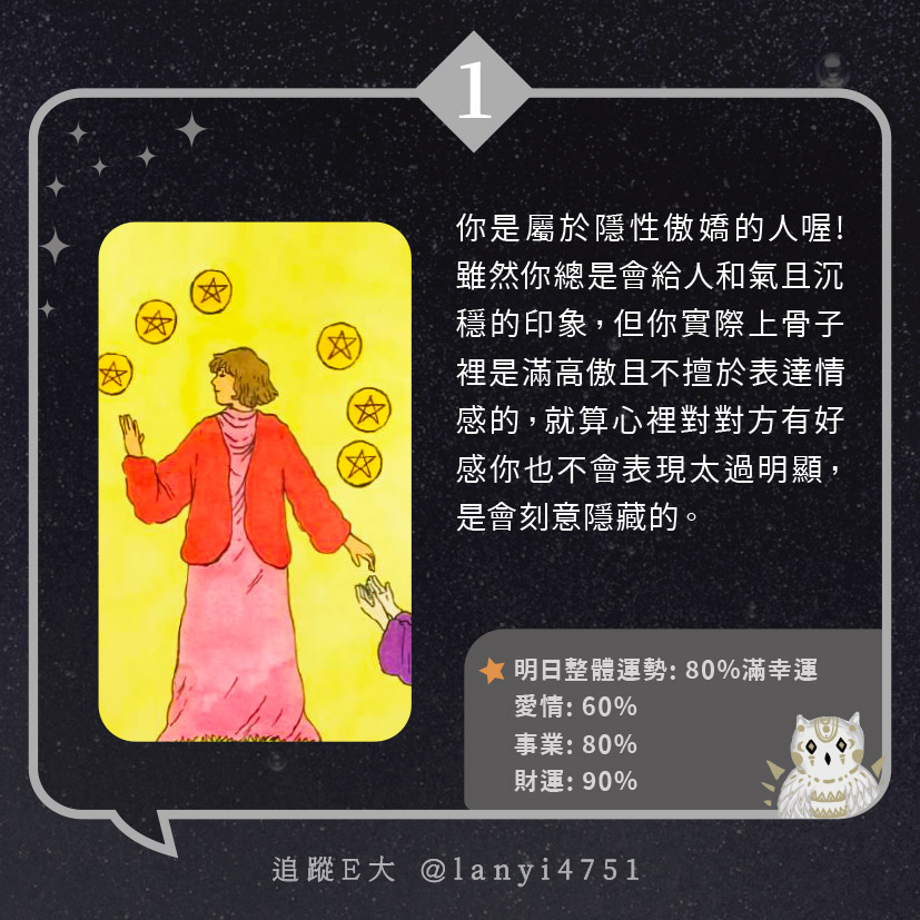 我屬於隱性傲嬌的人? 打從骨子裡的傲嬌本性|心理測驗|E大大 發表於2024 年 5 月 15 日 由E大大撰寫 嗨~我是E大,歡迎你來到我的塔羅世界,每天會跟大家分享有趣的塔牌測驗及塔羅知識喔! E大社群 / 占卜預約👉 https://linktr.ee/lanyi4751 E大社群 / 占卜預約👉 https://linktr.ee/lanyi4751 分享此文: 按一下即可分享至 X(在新視窗中開啟) X 按一下以分享至 Facebook(在新視窗中開啟) Facebook 喜歡 正在載入... 相關