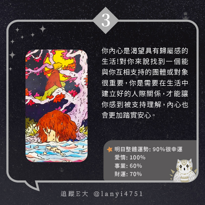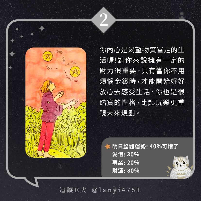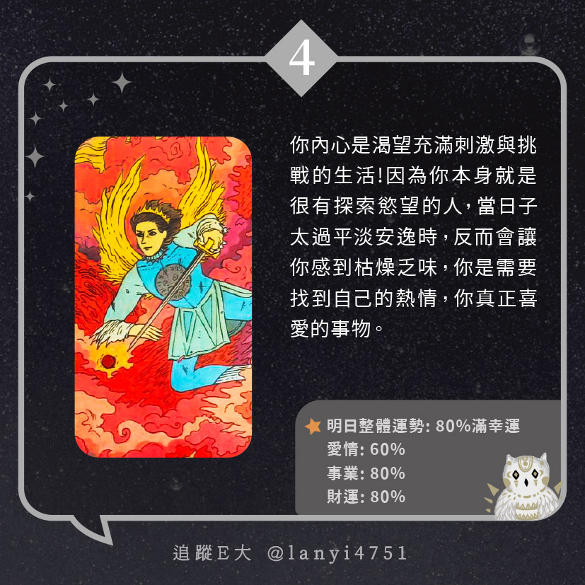 我內心渴望怎樣的生活?能讓你真正感到快樂的|心理測驗|E大大 發表於2024 年 5 月 17 日 由E大大撰寫 嗨~我是E大,歡迎你來到我的塔羅世界,每天會跟大家分享有趣的塔牌測驗及塔羅知識喔! E大社群 / 占卜預約👉 https://linktr.ee/lanyi4751 E大社群 / 占卜預約👉 https://linktr.ee/lanyi4751 分享此文: 分享到 X(在新視窗中開啟) X 分享到 Facebook(在新視窗中開啟) Facebook 喜歡 正在載入... 相關