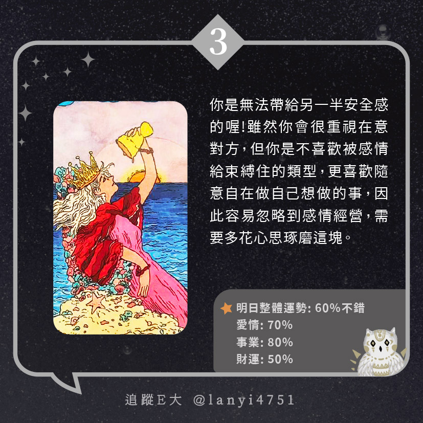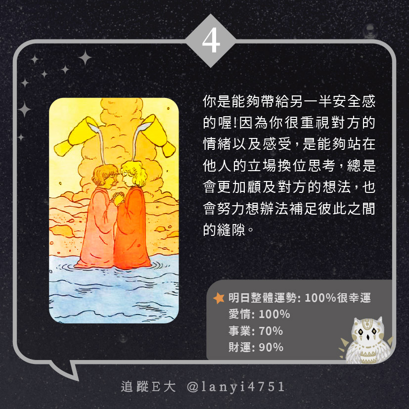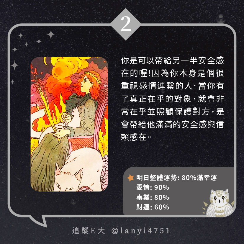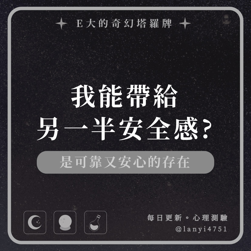 我能帶給另一半安全感?是可靠又安心的存在|心理測驗|E大大 發表於2024 年 5 月 25 日 由E大大撰寫 嗨~我是E大,歡迎你來到我的塔羅世界,每天會跟大家分享有趣的塔牌測驗及塔羅知識喔! E大社群 / 占卜預約👉 https://linktr.ee/lanyi4751 E大社群 / 占卜預約👉 https://linktr.ee/lanyi4751 分享此文: 分享到 X(在新視窗中開啟) X 分享到 Facebook(在新視窗中開啟) Facebook 喜歡 正在載入... 相關