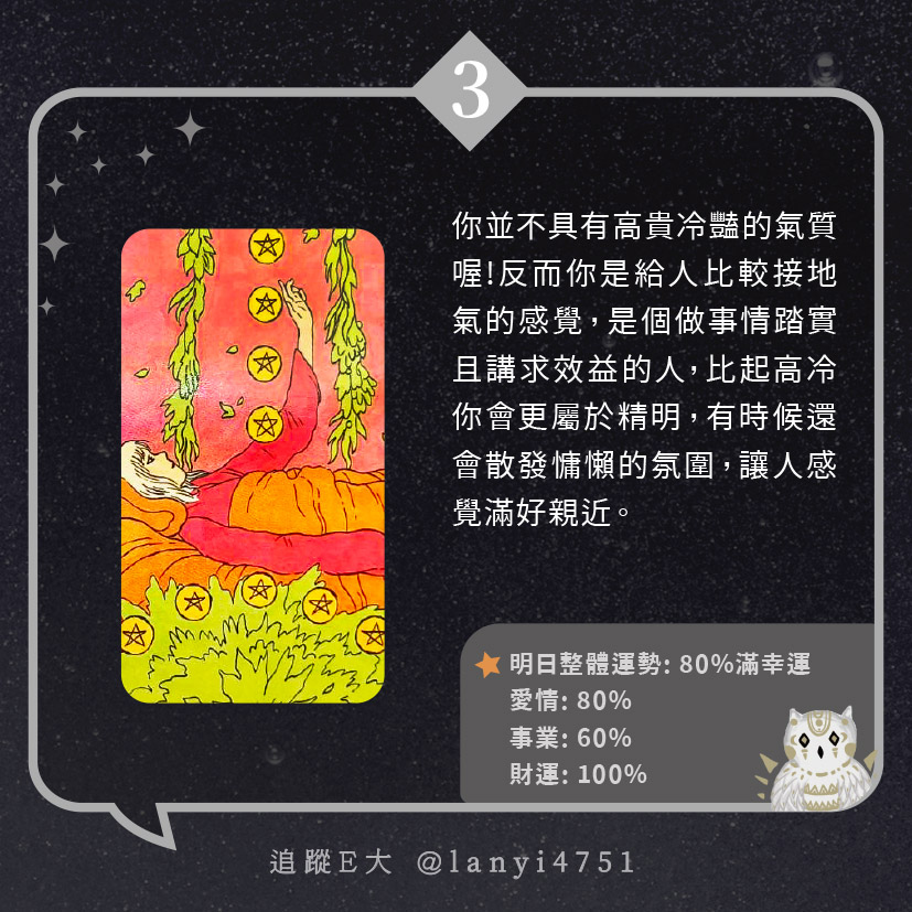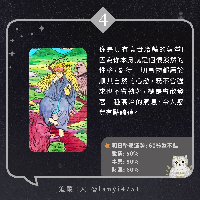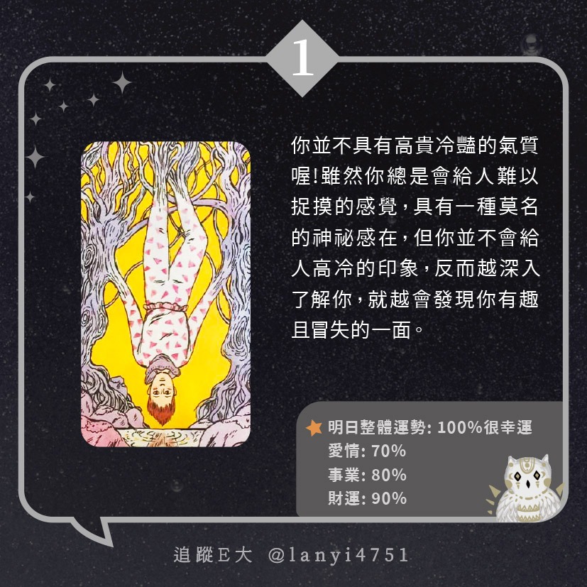 我具有高貴冷豔的氣質?給人高冷疏遠的氛圍|心理測驗|E大大 發表於2024 年 5 月 29 日 由E大大撰寫 嗨~我是E大,歡迎你來到我的塔羅世界,每天會跟大家分享有趣的塔牌測驗及塔羅知識喔! E大社群 / 占卜預約👉 https://linktr.ee/lanyi4751 E大社群 / 占卜預約👉 https://linktr.ee/lanyi4751 分享此文: 分享到 X(在新視窗中開啟) X 分享到 Facebook(在新視窗中開啟) Facebook 喜歡 正在載入... 相關