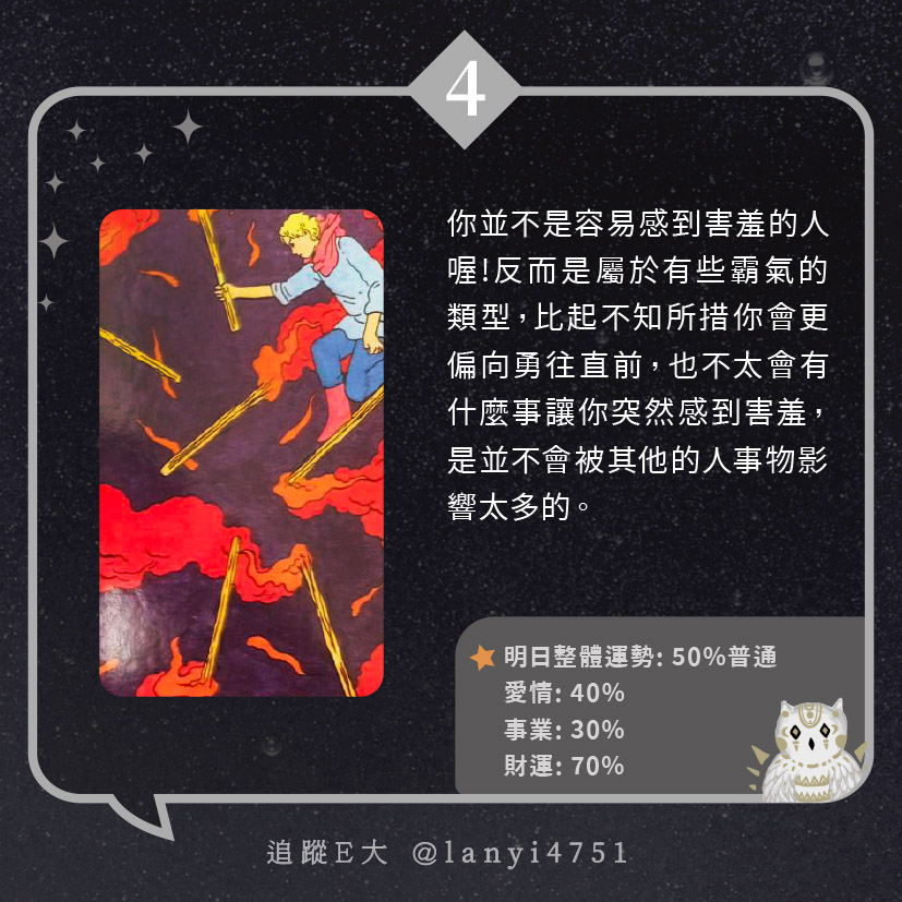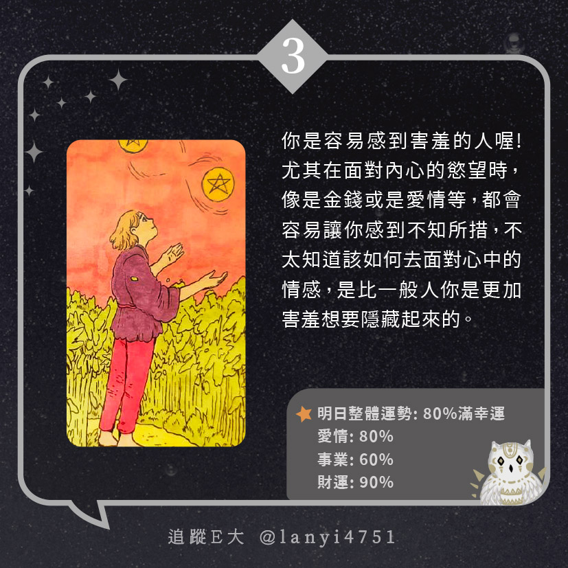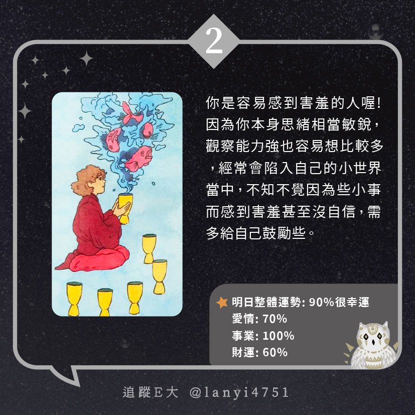 我是屬於容易害羞的人?經常感到不知所措|心理測驗|E大大 發表於2024 年 6 月 29 日 由E大大撰寫 嗨~我是E大,歡迎你來到我的塔羅世界,每天會跟大家分享有趣的塔牌測驗及塔羅知識喔! E大社群 / 占卜預約👉 https://linktr.ee/lanyi4751 E大社群 / 占卜預約👉 https://linktr.ee/lanyi4751 分享此文: 按一下即可分享至 X(在新視窗中開啟) X 按一下以分享至 Facebook(在新視窗中開啟) Facebook 喜歡 正在載入... 相關