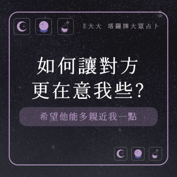 嗨~我是E大,歡迎你來到我的塔羅世界,創立這個平台主要是為了讓更多人對塔羅牌產生興趣,並且能透過牌卡找到自己人 … More 如何讓對方更在意我些?希望他能多親近我一點,測測看好了! |塔牌測驗💜